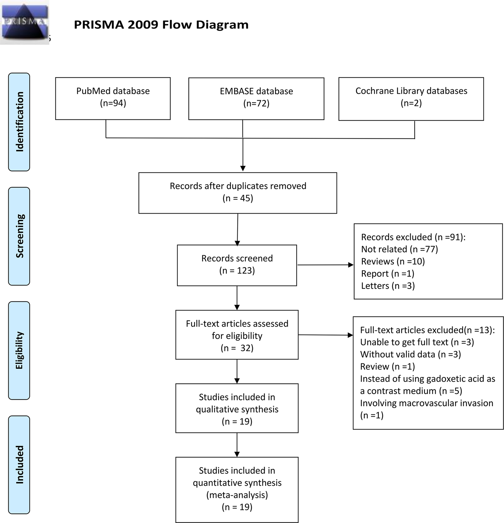 Following the research approach, 168 publications were obtained via PubMed, Embase, and Cochrane Library databases. Forty-five articles were removed as duplicates (Figure 1). Moreover, 91 articles were eliminated after a review of titles and abstracts on the basis of the following reasons: publications were not related to the prediction of MVI or were reviews or report or letters, leaving 32 studies for further screening. After checking for the full text, a review was excluded, and 3 investigations were eliminated due to the unavailability of the full text, 3 for not having valid data, 5 for not using gadoxetic acid as a contrast medium, and one for involving macrovascular invasion. Finally, a total of nineteen articles were involved in this paper and their characteristics are listed in Table 1.