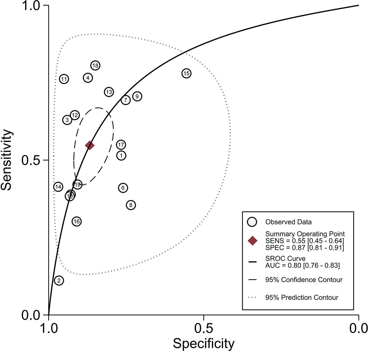 Up until Feb 24, 2022, the PubMed, Embase, and Cochrane Library databases were carefully searched for relevant material. The software packages utilized for this meta-analysis were Review Manager 5.4.1, Meta-DiSc 1.4, and Stata16.0. Summary results are presented as sensitivity (SEN), specificity (SPE), diagnostic odds ratios (DORs), area under the receiver operating characteristic curve (AUC), and 95% confidence interval (CI). The sources of heterogeneity were investigated using subgroup analysis.