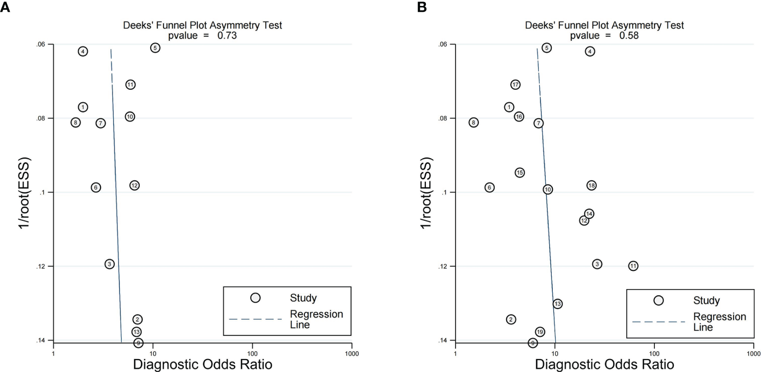 Deeks JJ Macaskill P Irwig L . The Performance of Tests of Publication Bias and Other Sample Size Effects in Systematic Reviews of Diagnostic Test Accuracy was Assessed. J Clin Epidemiol (2005) 58(9):882–93. doi: 10.1016/j.jclinepi.2005.01.016