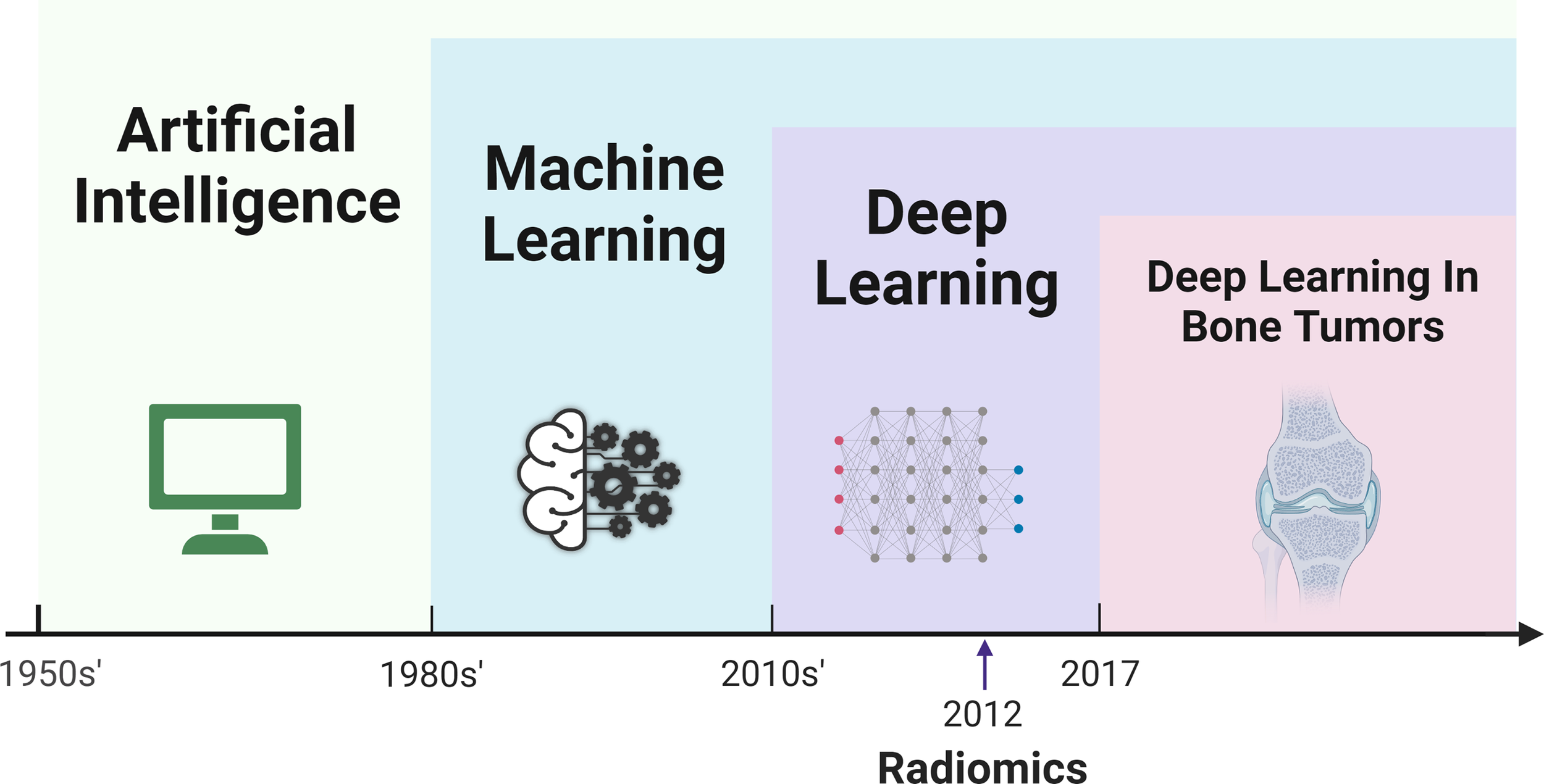 Timeline of the development of artificial intelligence, machine learning, radiomics, deep learning, and application of deep learning in field of bone tumor.