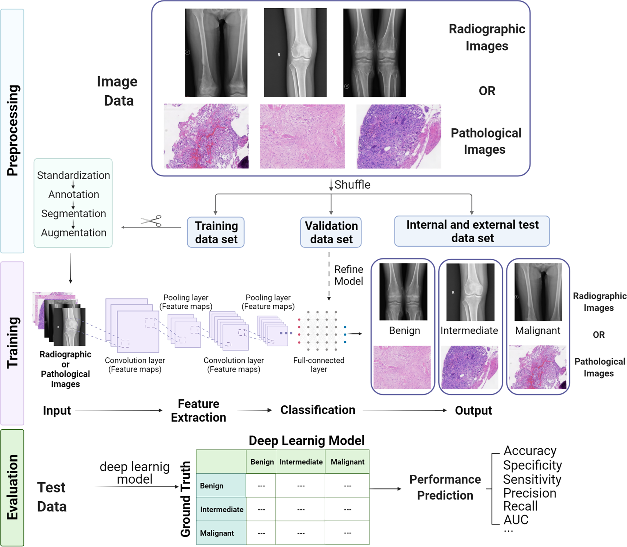 Workflow of building a deep learning model for bone tumor classification based on radiological and pathological images, including preprocessing, training, and evaluation.