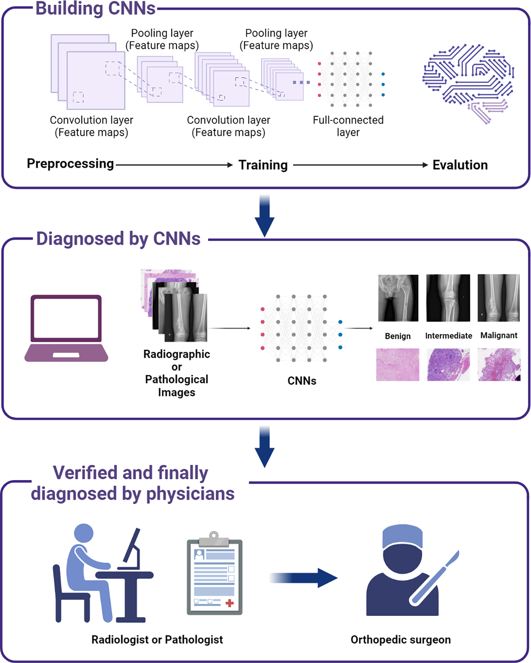 A scheme showing the process of incorporating deep learning models to assist bone tumor diagnosis and thereby facilitate decision making in clinical practice.