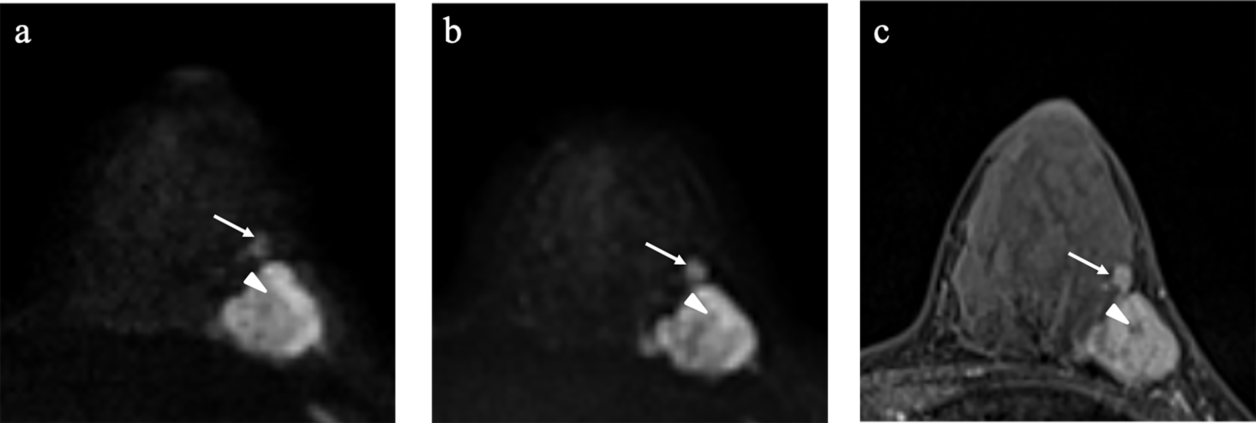 Breast MRI is the most sensitive imaging modality for the evaluation of breast cancer detection, diagnosis, and prognosis (1, 2). Diffusion-weighted imaging (DWI) can be used as an adjunct sequence to dynamic contrast-enhanced MRI (3–6).