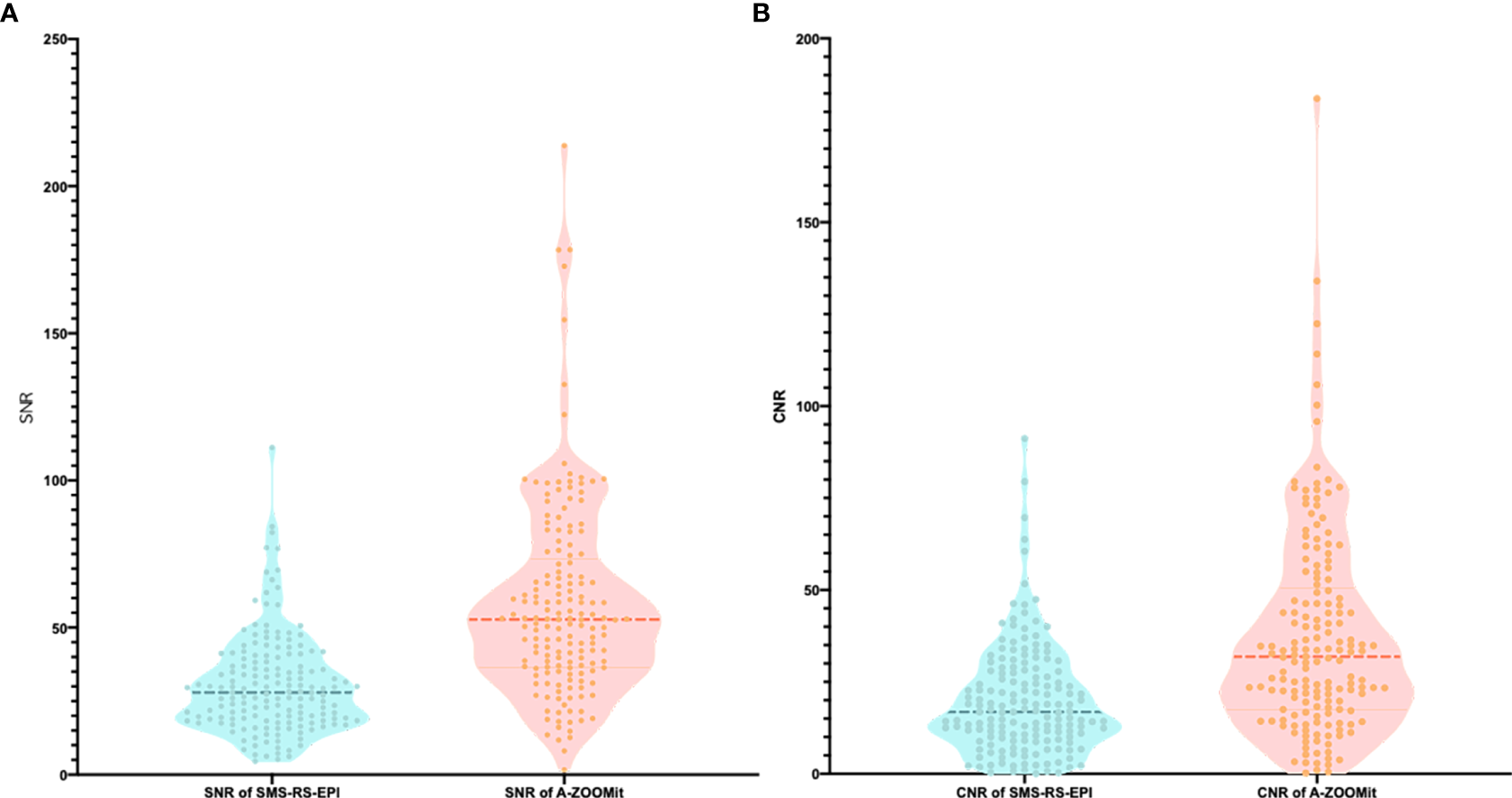 The mean lesion conspicuity scores of the A-ZOOMit and SMS-RS-EPI showed a significant difference (4.93 ± 0.29 vs. 3.87 ± 0.47, p < 0.0001, respectively, in the multireader study).