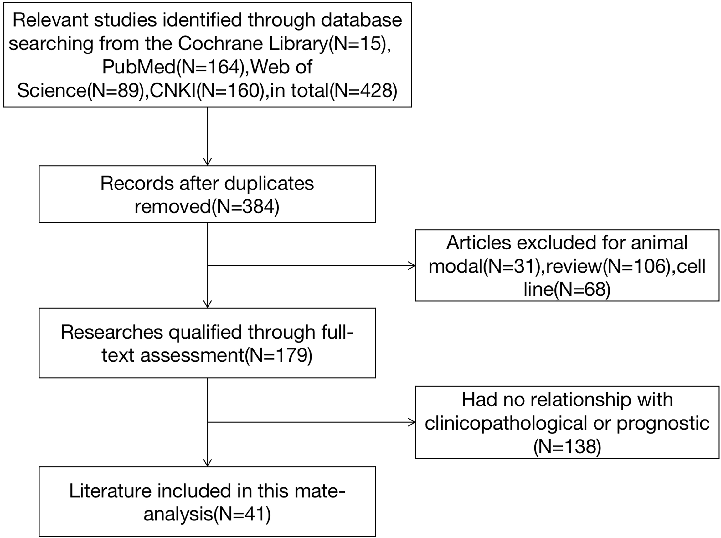 Initially, 428 relevant studies were identified according to the search strategy. From there, 387 articles were excluded for not meeting the inclusion criteria (Figure 1). Ultimately, 41 studies were included in this meta-analysis, comprising 29 studies from China, 5 from Germany, 3 from Japan, and 1 each from Spain, England, Australia, and Belgium. In total, 5,301 patients were included in the analysis, representing 3,604 cases from China, 586 from Germany, 445 from Japan, and 666 from the other four countries. The cancer types included hepatocellular carcinoma (HCC), breast cancer (BC), colorectal cancer (CRC), gastric cancer (GC), lung cancer, osteosarcoma, laryngeal neoplasms, ovarian carcinoma, endometrial carcinoma, gallbladder cancer, B-cell lymphoma, malignant glioma, thyroid cancer, pancreatic cancer, and synovial sarcoma (SS). For the detection of PLK-1 expression, quantitative real-time (qRT)-PCR was used in four studies and immunohistochemistry was used in the other 37 studies. The characteristics of all included studies are listed in Table 1.