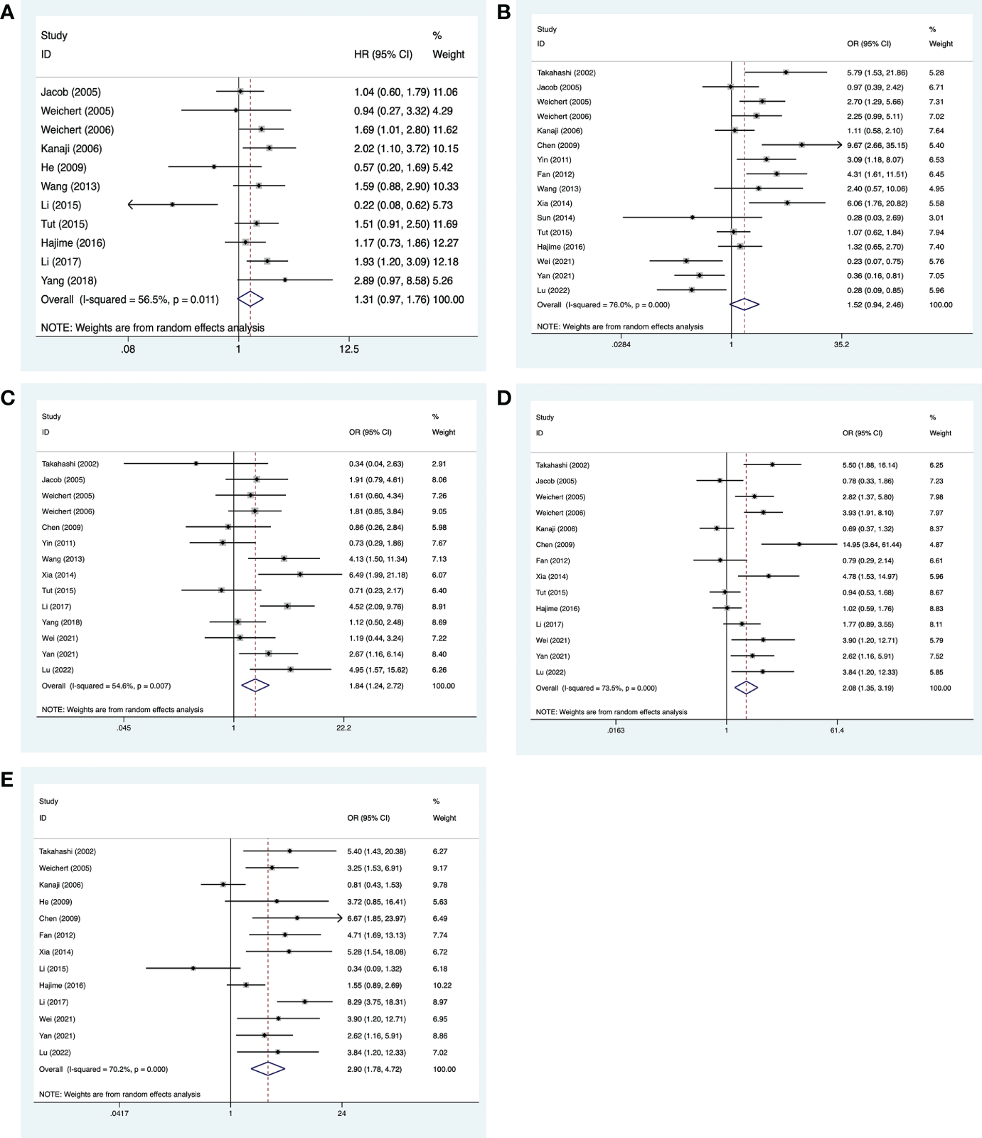 Figure 4 Meta-analysis for the association between PLK-1 expression levels and clinicopathological parameters in cancers of the digestive system. (A) 5-year survival; (B) lymph node metastasis; (C) histological grade; (D) primary tumor grade; (E) clinical stages.
