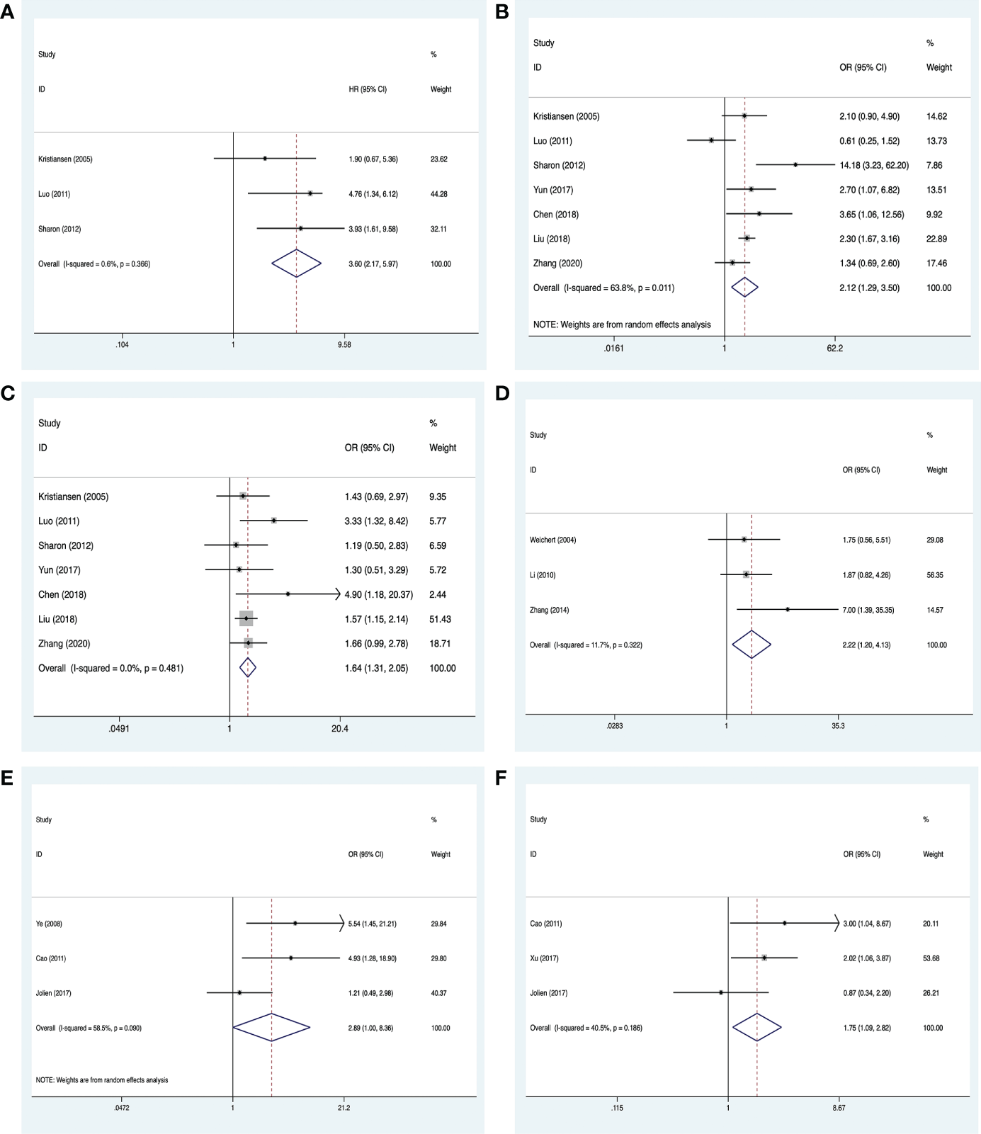 Figure 5 Meta-analysis for the association between PLK-1 expression levels, breast cancer, and cancers of the respiratory system and female reproductive system. (A) 5-year overall survival for breast cancer; (B) histological grades in breast cancer; (C) lymph node metastasis in breast cancer; (D) clinical stages in cancers of the female reproductive system; (E) lymph node metastasis in cancers of the respiratory system; (F) clinical stages in cancers of the respiratory system.