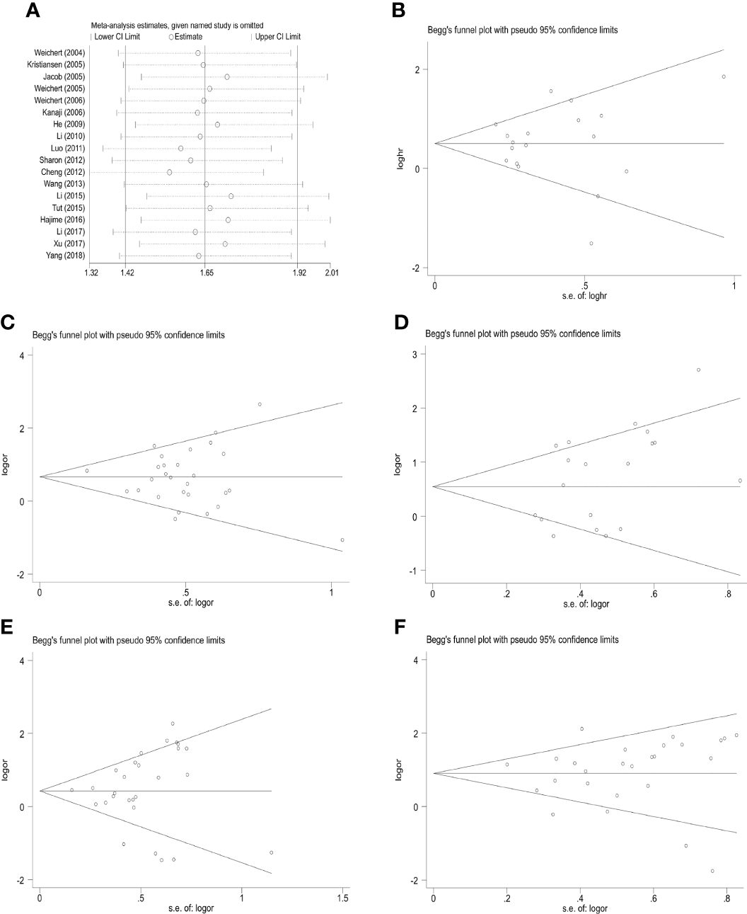 Figure 6 Sensitivity analysis and funnel plot for publication bias testing of the PLK-1 analyses and the clinicopathological parameters of cancer patients. (A) sensitivity analysis for 5-year overall survival; (B) publication bias plots for analyses of 5-year overall survival; (C) histological grade; (D) primary tumor grade; (E) lymph node metastasis; (F) clinical stages.