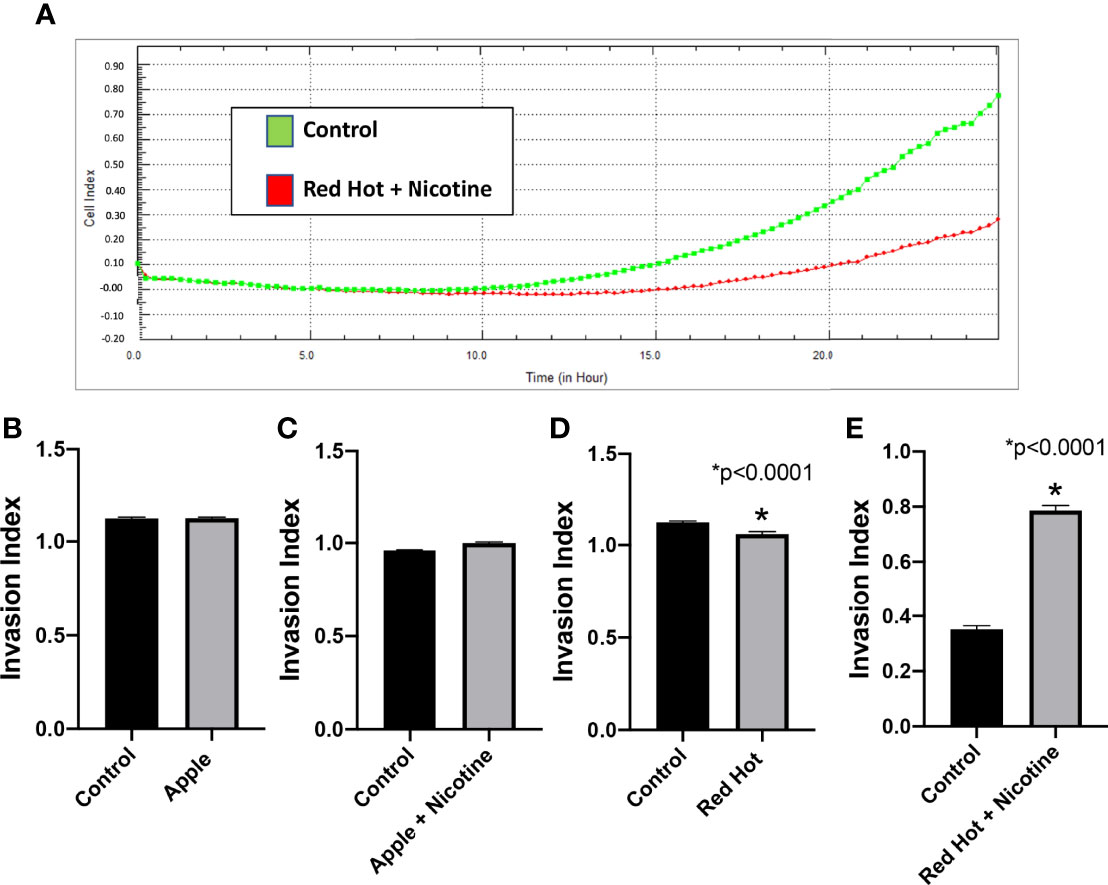 Figure 4 Ca9-22 invasion with Green Apple or Red Hot EVE. A representative diagram of readout cells over time invasion is shown in (A). At 24 hours of culture, Green Apple EVE did not affect Ca9-22 invasion with or without nicotine (B, C). Treatment with Red Hot EVE decreased Ca9-22 invasion (D) and Red Hot with nicotine enhanced Ca9-22 invasion (E) when compared to c untreated controls. Data are shown with *p ≤ 0.05.
