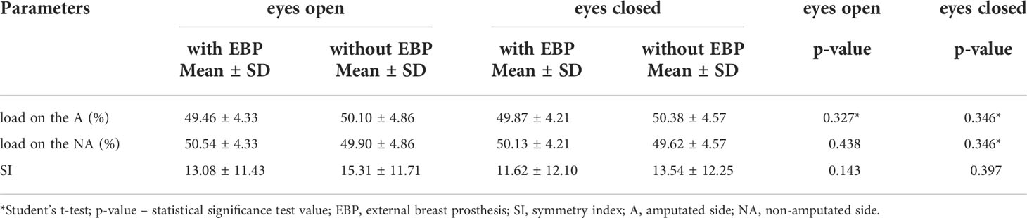 While previous studies referred to the stability measurements obtained in tests with EBP (e.g., of different weights), often with results obtained from healthy counterparts (independent sample comparisons), which could raise doubts regarding homogeneity of the studied groups, our study compared dependent samples, i.e., stability measurements obtained in the tests with the target breast prosthesis with which the patient functions on a daily basis and also without it.