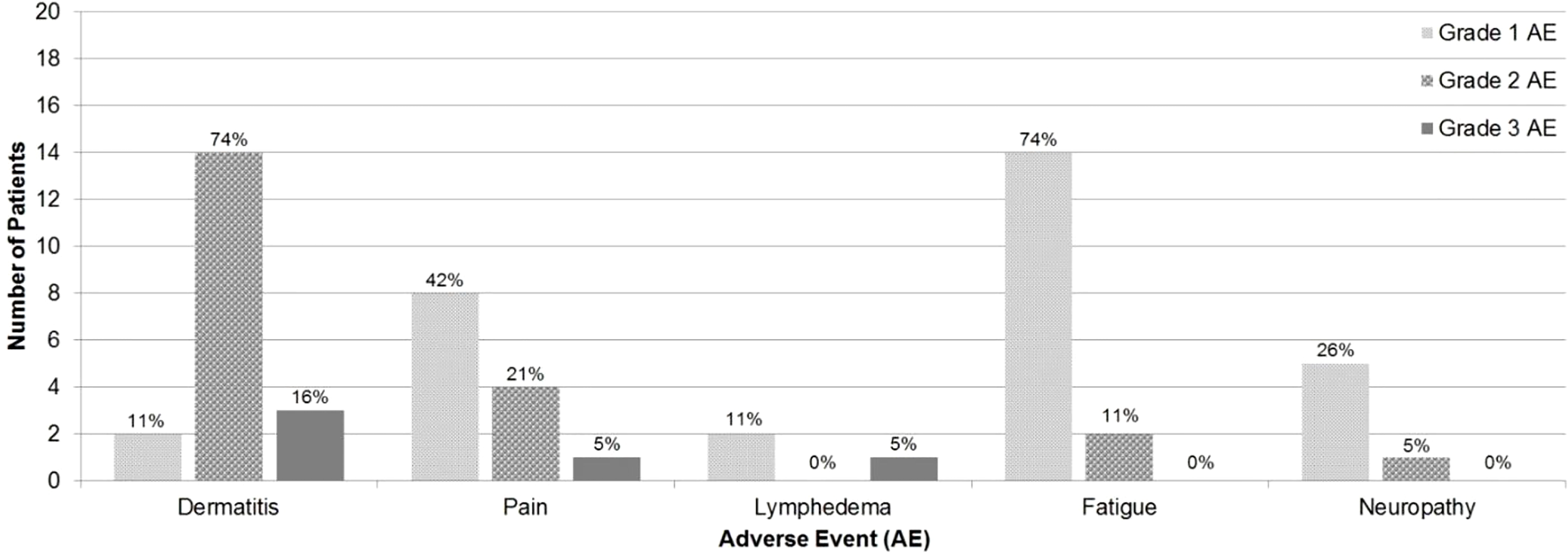 Maximum grade AE was grade 2 in 13 (69%) patients and grade 3 in 4 (21%) patients. No patients experienced grade 4 or grade 5 AEs. Acute AEs were as follows: dermatitis (63% grade 2, 11% grade 3), pain (21% grade 2, 5% grade 3), fatigue (11% grade 2), and neuropathy (5% grade 2). Late AEs were as follows: dermatitis (11% grade 2, 5% grade 3) and lymphedema (5% grade 3) (Figure 1).