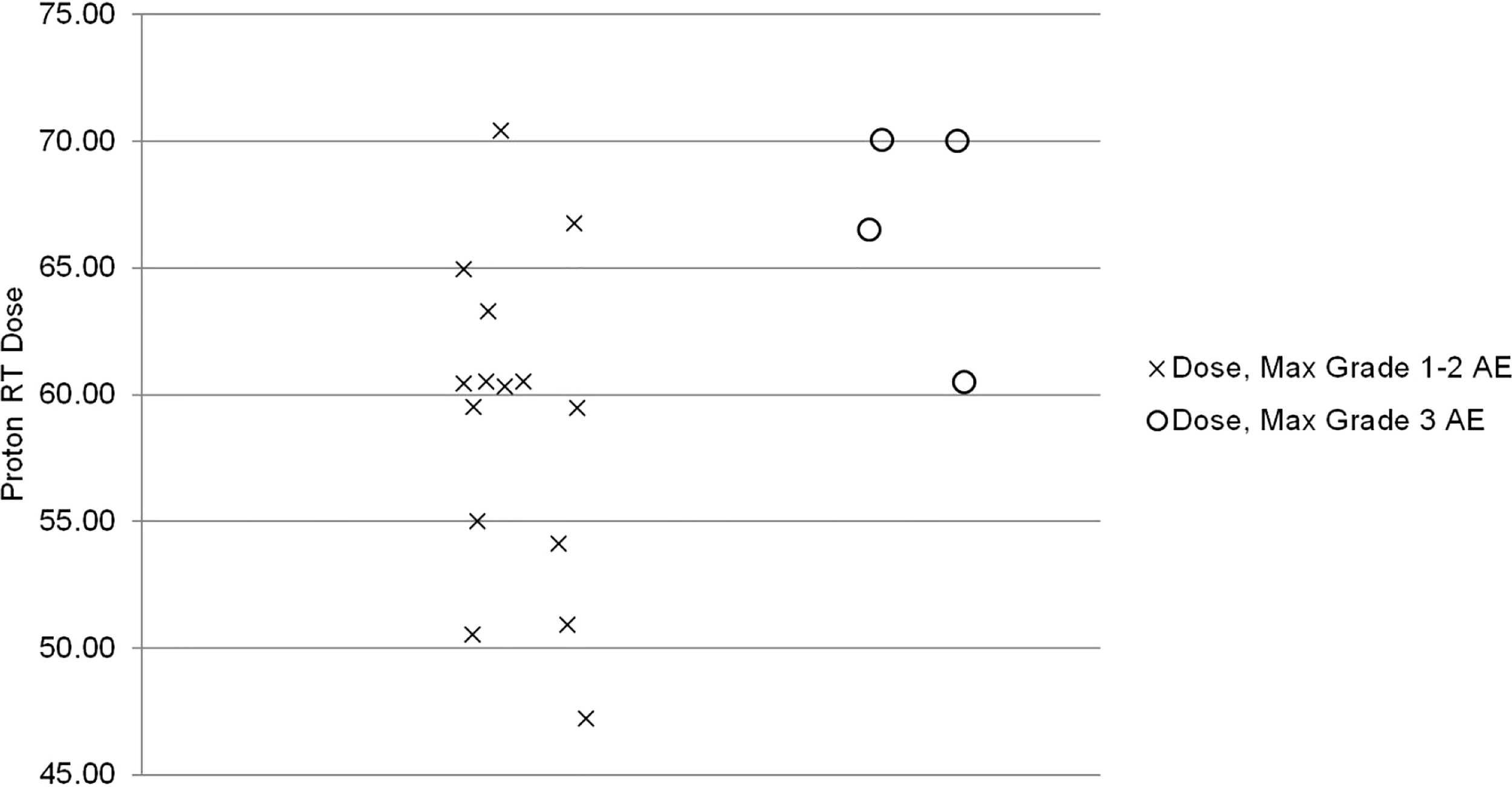 The median proton therapy dose was significantly associated with a maximum grade ≥3 AEs (p=0.04). All grade 3 AEs occurred in patients receiving > 60 GyE. The Spearman correlation coefficient (ρ) for the strength of association was 0.5 (high correlation p=0.04, Figure 2) (12).