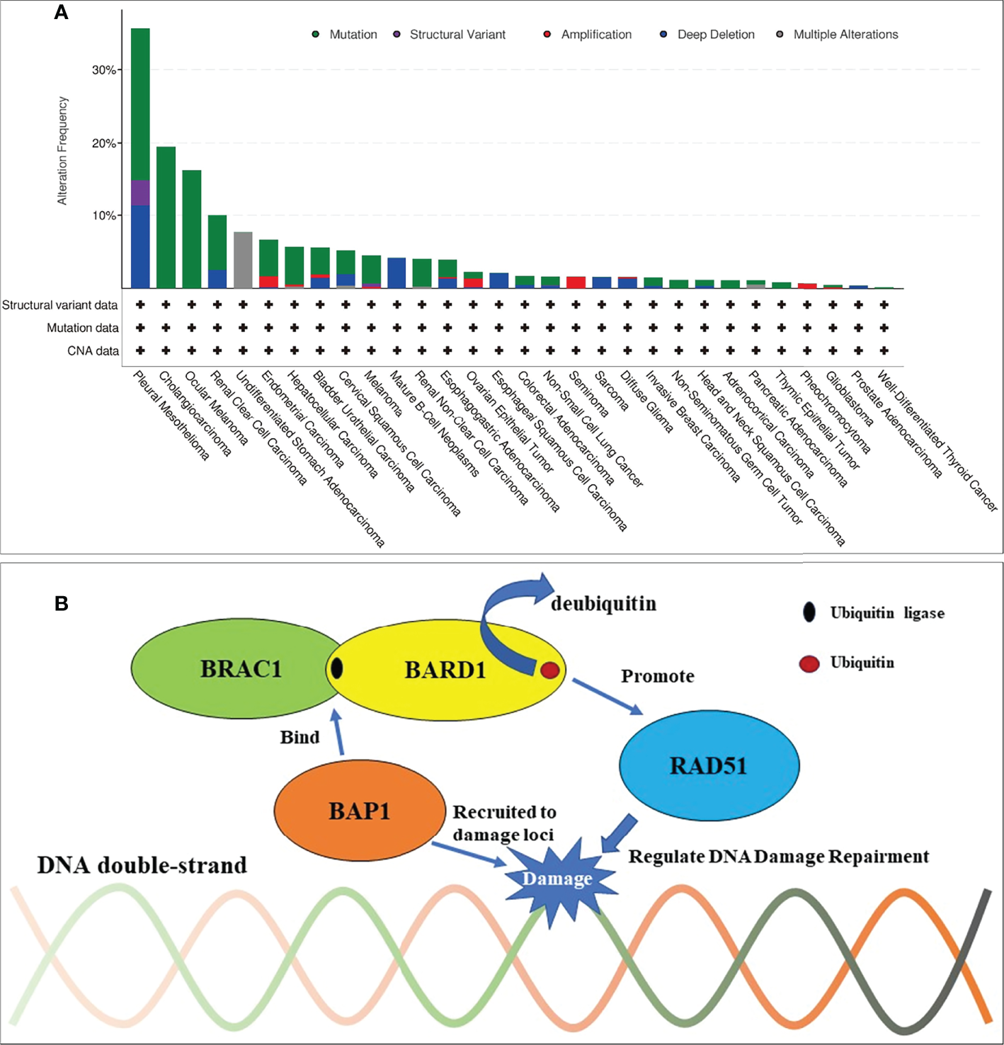 Frequencies of BAP1 alteration across cancer types and mechanism of BAP1 in DNA damage repairment. (A)BAP mutations most commonly occurred in pleural mesotheliomas, cholangiocarcinoma, ocular melanoma, and renal clear cell carcinoma from a total of 32 large-scale TCGA PanCancer Atlas Studies that contained 10,967 samples. (B) Mechanism of BAP1 in DNA damage repairment. BRCA1/BARD1 complex is an E3 ubiquitin ligase and interacts with the recombinase RAD51 to regulate the homologous recombination repairment. BAP1 can be recruited to DNA damage loci and bind to the BRCA1/BARD1 complex. By this, BAP1 can inhibit the E3 ligase activity of BRCA1/BARD1 to protect against additional ubiquitination and deubiquitinate preexisting ubiquitin chains (bent arrow).