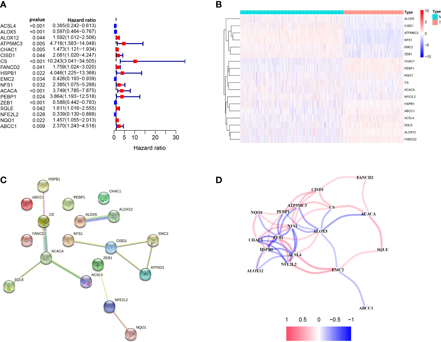 Identification of candidate ferroptosis-related genes in TCGA cohort. (A) Forest plot of univariate Cox regression analysis. (B) The expression of 18 genes in cancer tissues. (C) The interaction between 18 candidate genes in the PPI network. (D) The correlation network of candidate genes. The correlation coefficients are represented by different colors.