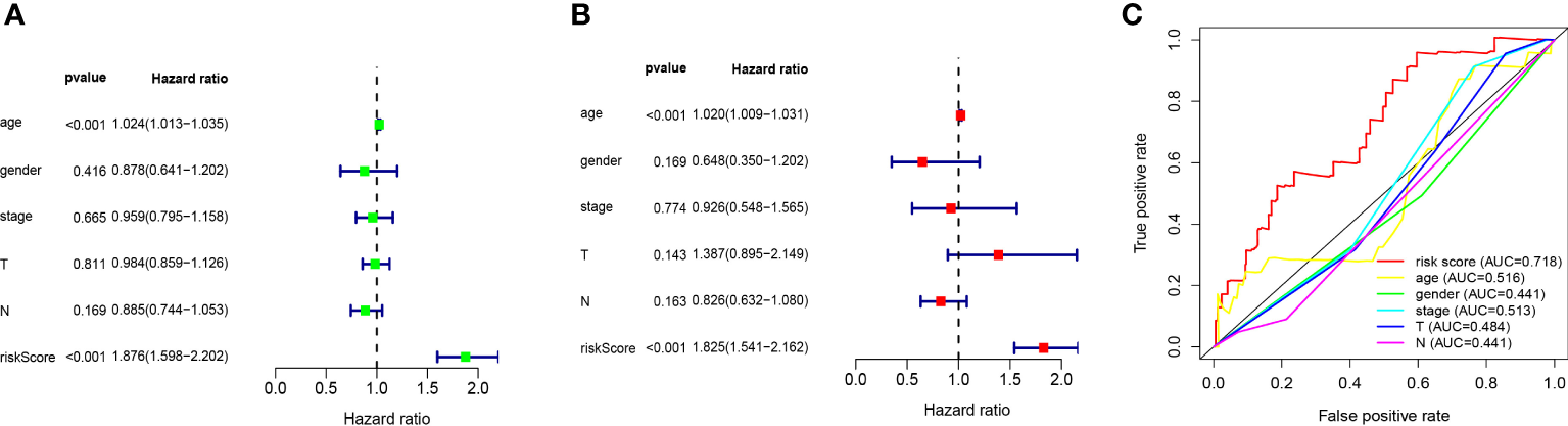Evaluation of ten ferroptosis-related-lncRNA prognostic risk models in melanoma. (A) Univariate and (B), multivariate Cox regression analysis of risk model score and clinical characteristics on prognosis. (C) The risk model score and AUC of clinical characteristics were calculated according to the ROC curve. Clinical features include age, sex, stage and TNM stage.