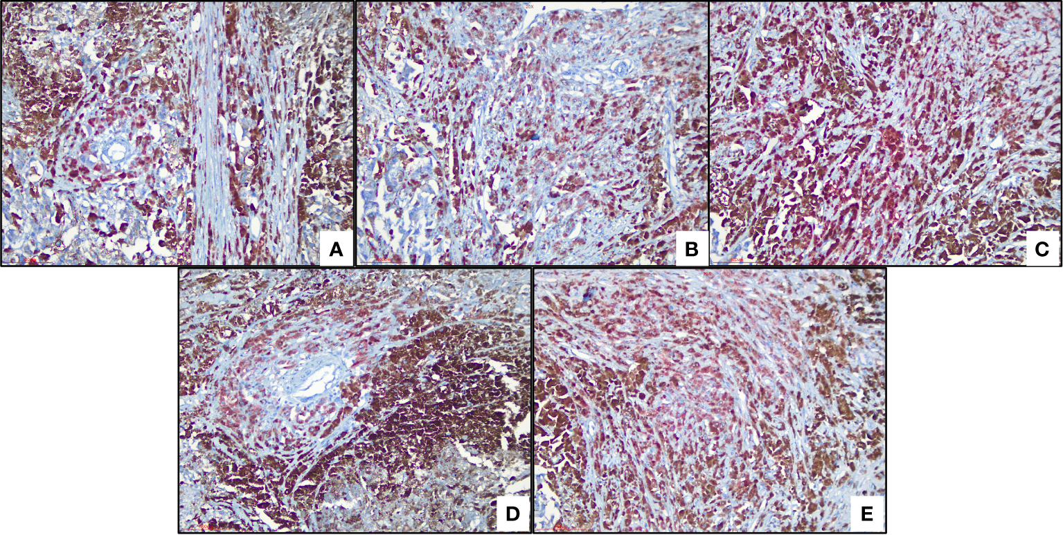 Immunohistochemical analysis of ferroptosis-related proteins (A) Cytoplastic expression of ALOX5 (red color means positive) (B) Cytoplastic expression of PEBP1 (red color means positive). (C) Expression of ACSL4, (red color means positive) (D) ZEB1 (red) and (E) ZEB1 (red) stain the cytoplasm of tumor cells.