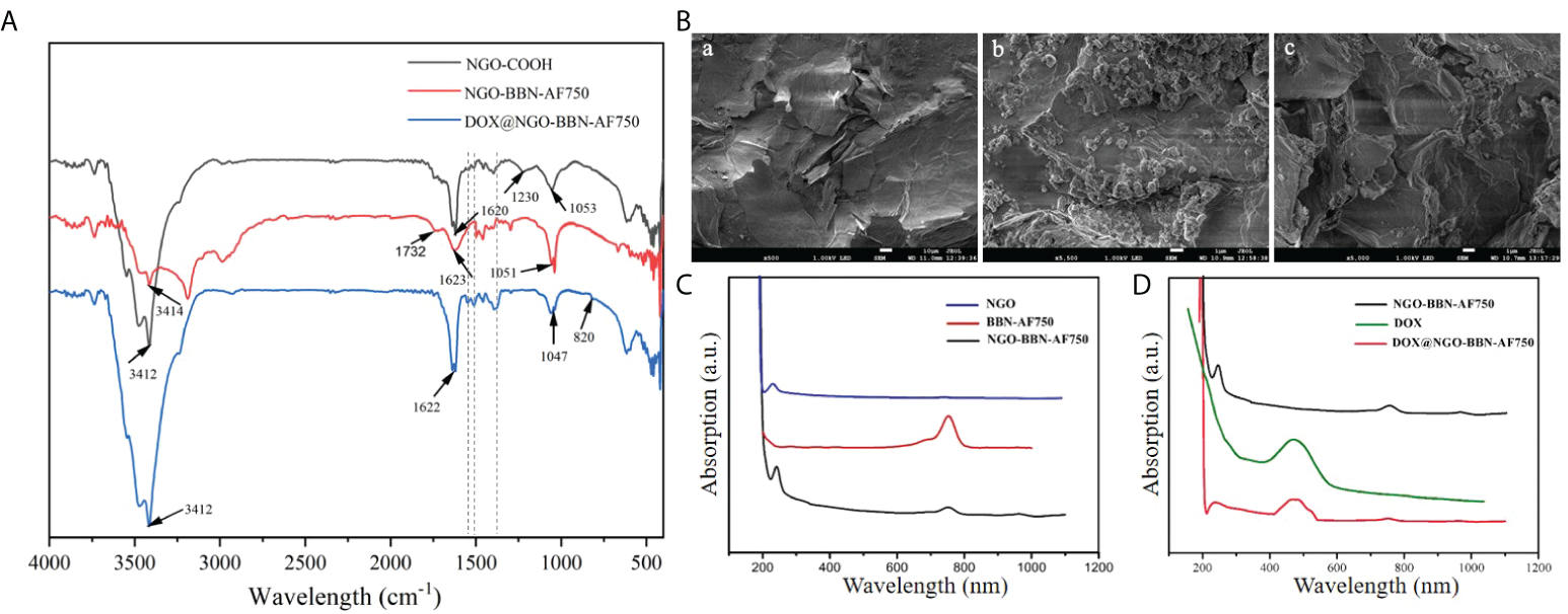 Characterizations of the nanoprobes. (A) Fourier transform infrared (FT-IR) spectroscopy of NGO-COOH, NGO-BBN-AF750, and DOX@NGO-BBN-AF750. (B) SEM images of NGO (a), BBN-AF750 (b), and DOX@ NGO-BBN-AF750 (c). Scale bars: 10 µm. (C) UV–Vis spectra of NGO, BBN-AF750, and NGO-BBN-AF750. (D) UV–Vis spectra of DOX, NGO-BBN-AF750, and DOX@NGO-BBN-AF750.
