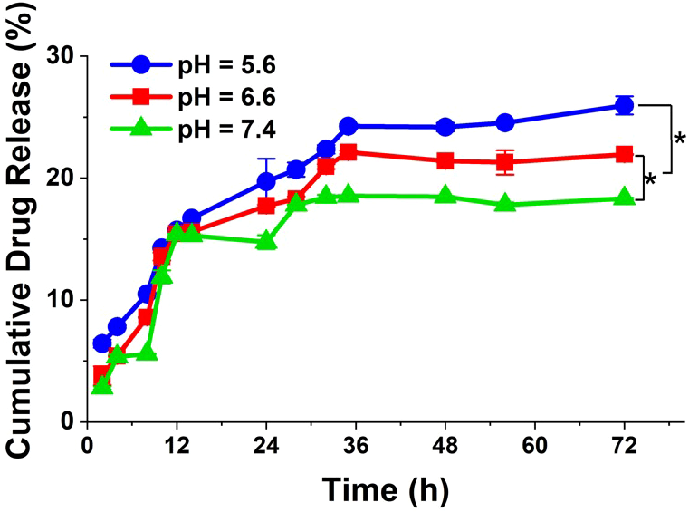 In vitro release profiles of DOX from DOX@NGO-BBN-AF750 under different pH values at 37°C. Data were obtained from n = 3 repeated experiments. *P < 0.05.