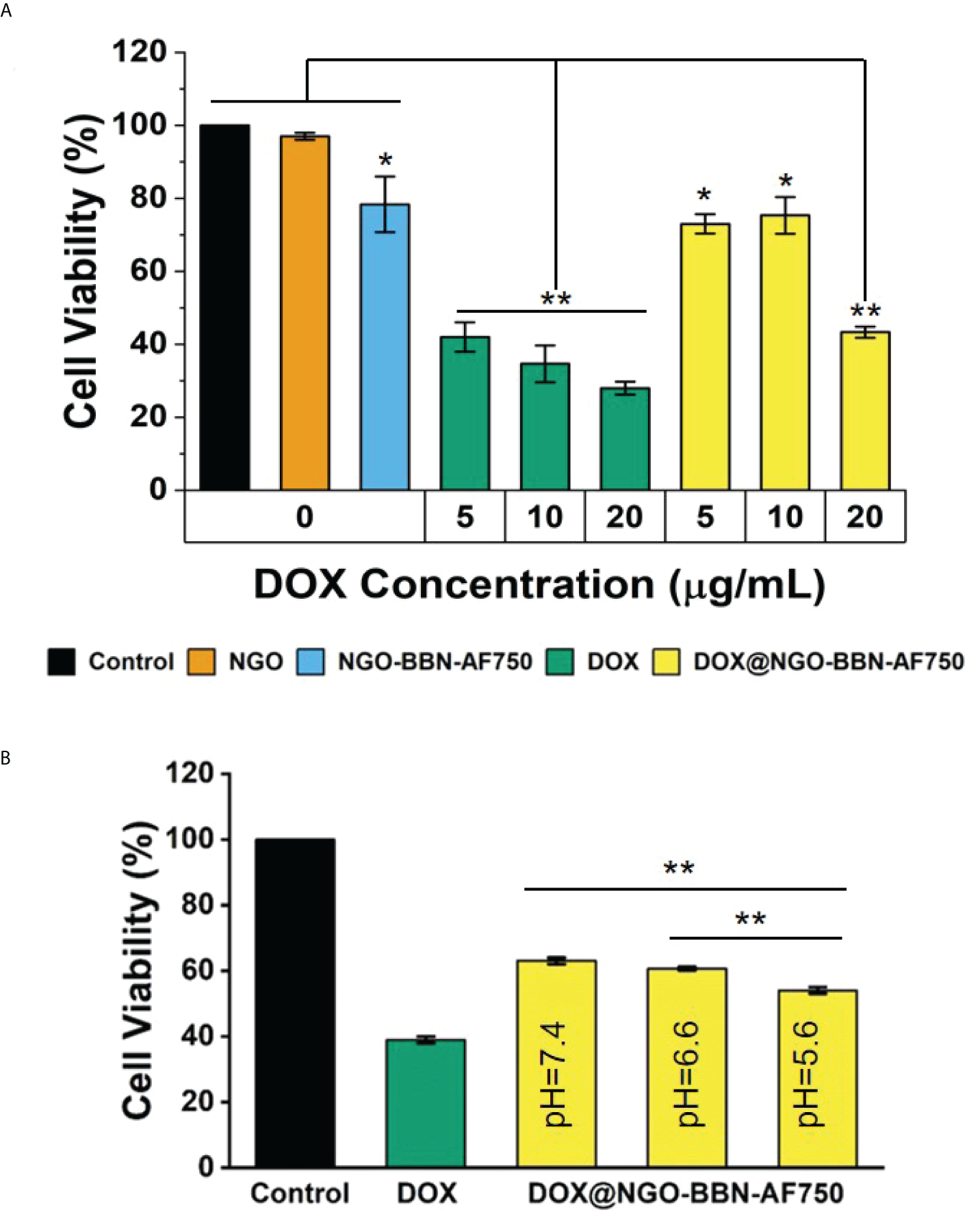 In vitro cytotoxicity of DOX and DOX@NGO-BBN-AF750 nanoprobes on HSC-3 cells. (A) Cell viability after treatment with NGO and NGO-BBN-AF750 or DOX and DOX@NGO-BBN-AF750 at different DOX concentrations (pH = 7.4). ** P < 0.01 compared with control, NGO, and NGO-BBN-AAF750 groups. *P < 0.05 compared with the control group. (B) Cell viability after treatment with DOX@NGO-BBN-AF750 at different pH environments (DOX = 5 µg/ml). Data were obtained from n = 5 measurements and are presented as mean ± SD. **P < 0.01.