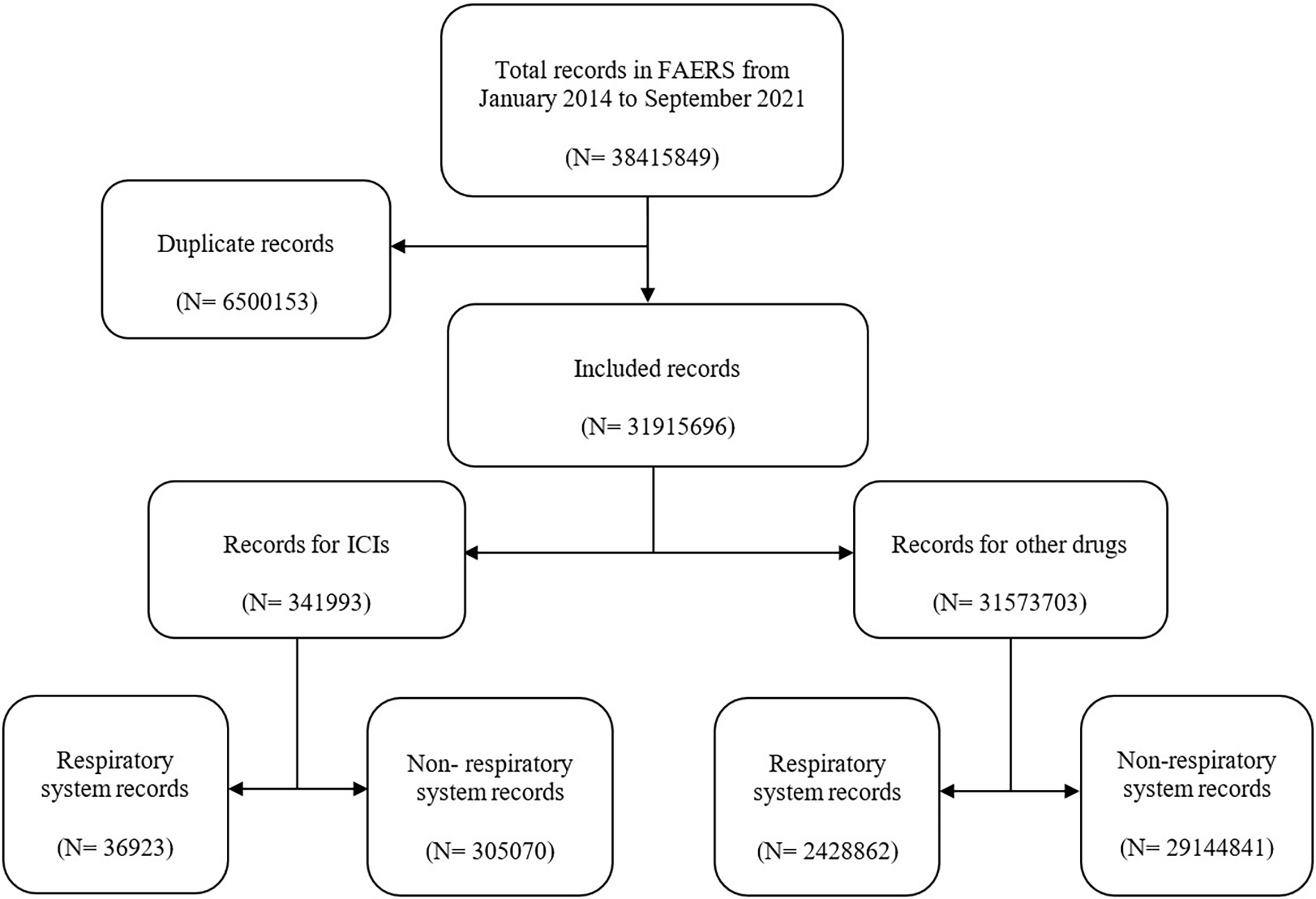 In this study, a total of 38,415,849 records were extracted from the FAERS database (Figure 1). After exclusion of duplicates, the number of records was 31,915,696, among which 341,993 reports were associated with ICI-related AEs. Then, 36,923 records were found to be associated with respiratory system AEs in ICI-related AEs. Moreover, 2,428,862 records were related to respiratory system AEs in other drug AEs.