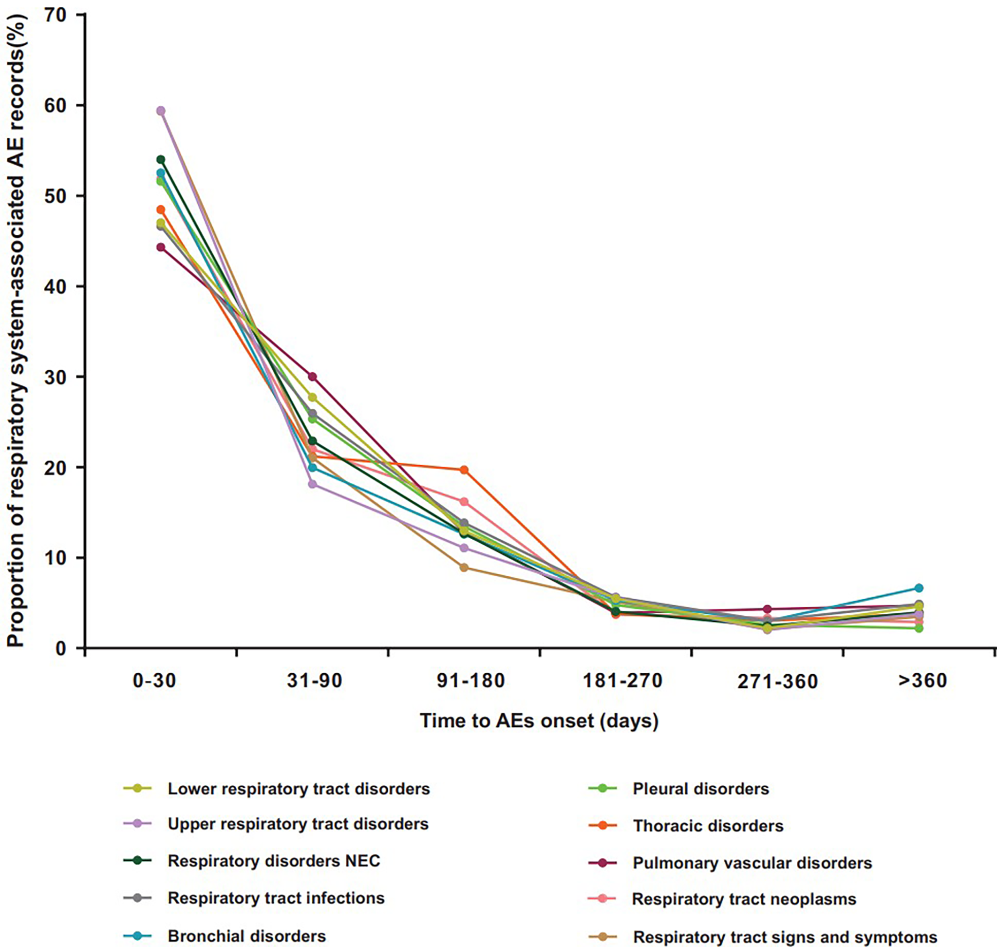 Time to onset for ICI-related class-specific respiratory system AEs. AEs, adverse events; ICIs, immune checkpoint inhibitors.