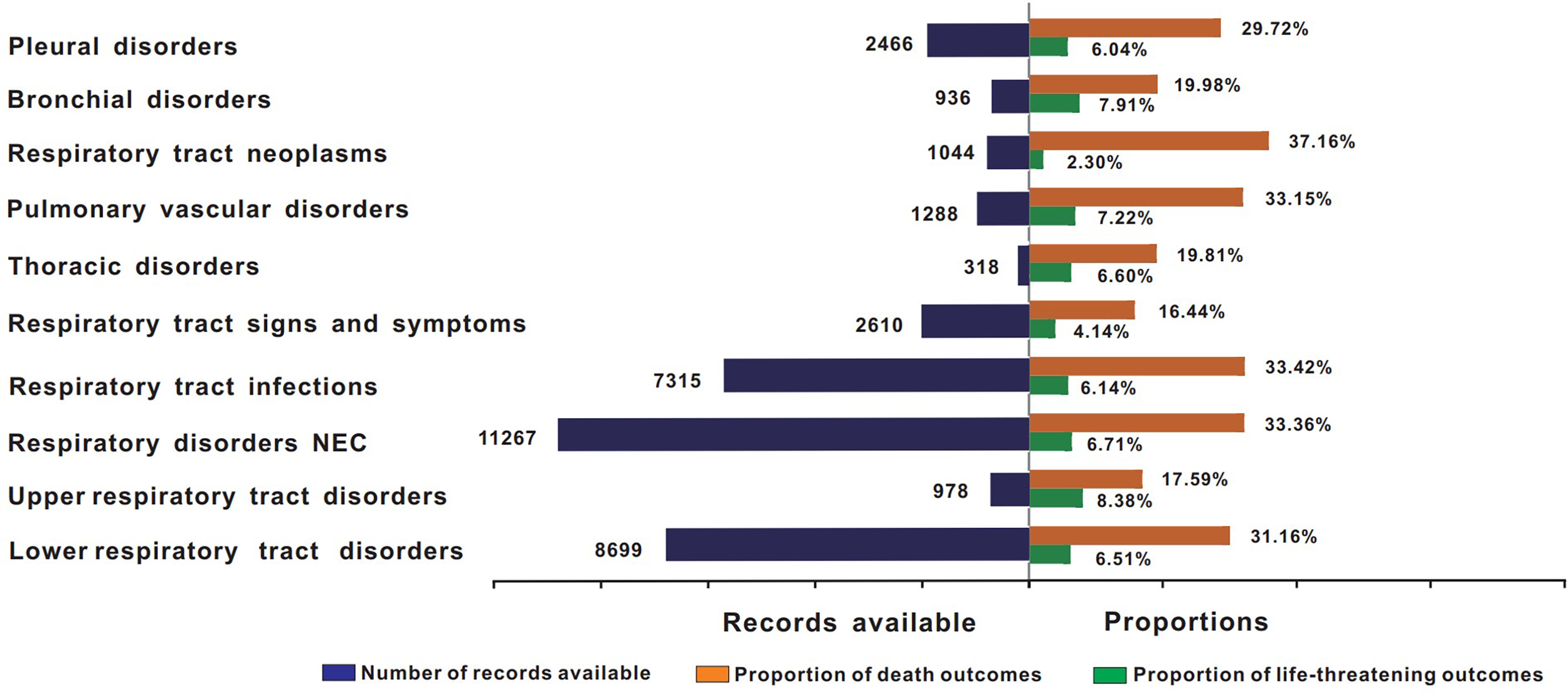 Figure 3 shows the death and life-threatening proportions according to the types of respiratory system AEs. In general, death accounted for 30.64% of all ICI-associated respiratory system AE records with available final outcome information (Table 2). Further analysis showed that the severity of these events varied. In total, lower respiratory tract disorders, respiratory disorders NEC, respiratory tract infections, respiratory tract neoplasms, pulmonary vascular disorders, and pleural disorders were the six conditions with the highest proportions of death in all ICI regimens (31.16%, 33.36%, 33.42%, 37.16%, 33.15%, and 29.72%, respectively).