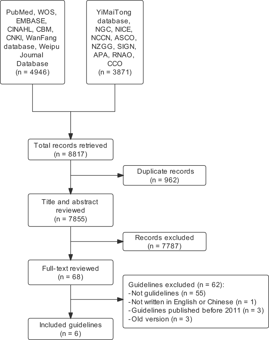 A systematic search of relevant clinical practice guidelines was undertaken to identify and select the clinical practice guidelines related to psychological distress among cancer patients. Literature databases were searched in PubMed, Web of Science, Excerpta Medica Database, the Cumulative Index to Nursing & Allied Health Literature, China Biology Medicine, China National Knowledge Infrastructure, WanFang and Weipu Journal Database. The guideline databases include Yimaitong Guidelines Network, National Guideline Clearinghouse, National Institute for Health and Clinical Excellence, American Society of Clinical Oncology (ASCO), New Zealand Guidelines Group, Scottish Intercollegiate GuidelinesNetwork, American Psychological Association, Registered Nurses’ Association of Ontario and Cancer Care Ontario (CCO). Four independent reviewers assessed the eligible guidelines using the Appraisal of Guidelines for Research and Evaluation (AGREE II) instrument.