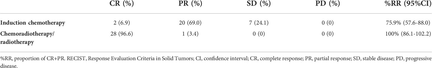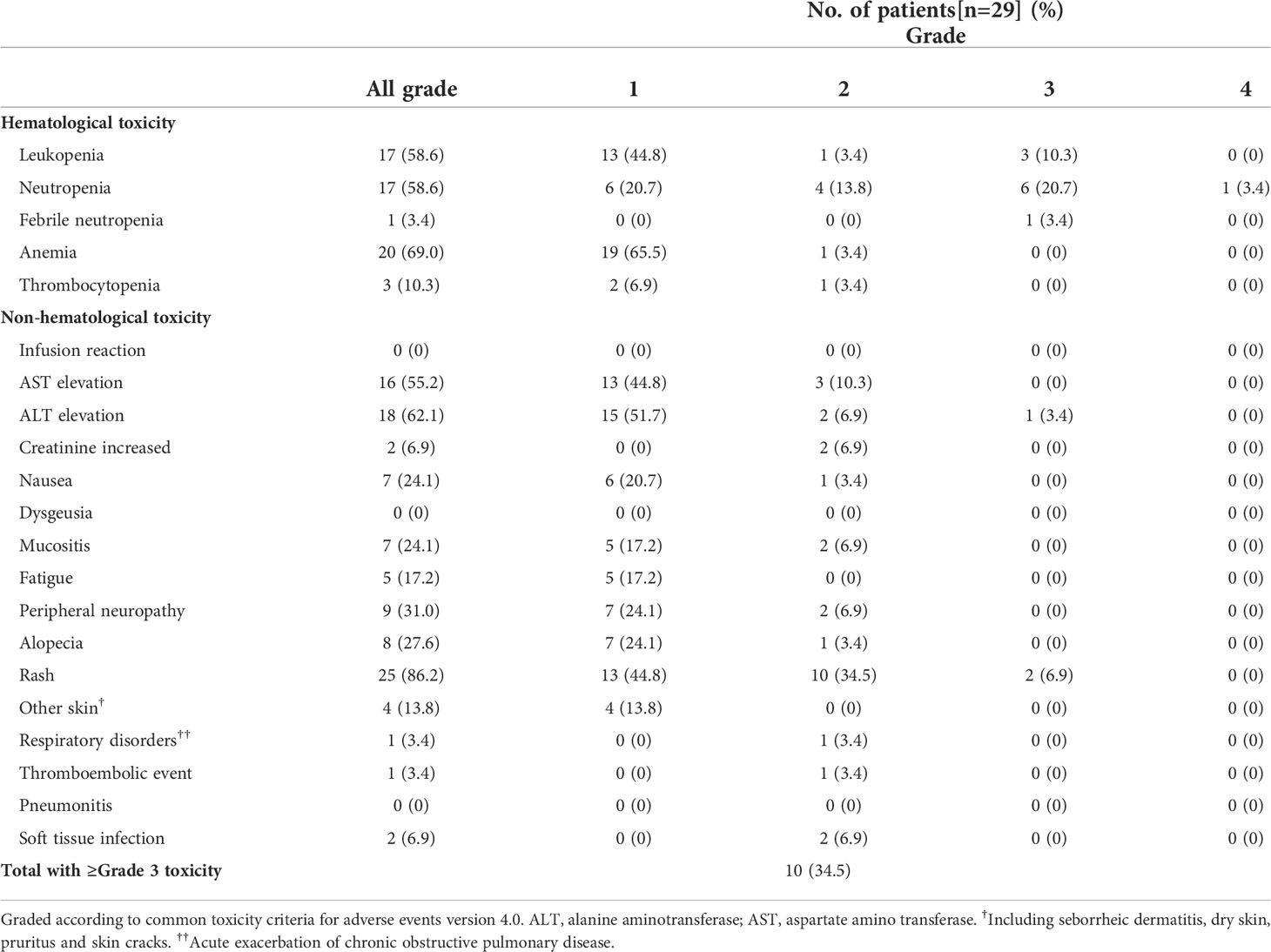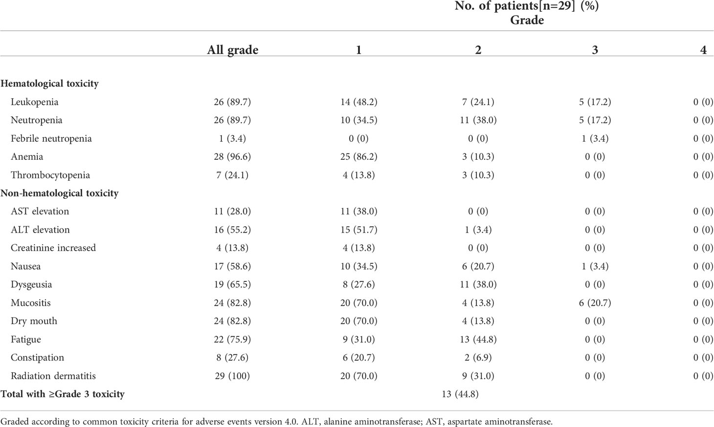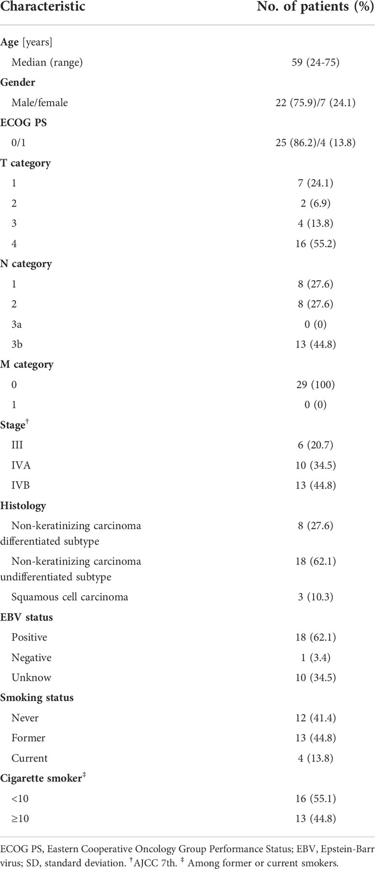 During the study period, 29 LA-NPC patients were included in the study. Baseline patient characteristics are presented in Table 1. Median age was 59 years (24−75 years), and all patients had an ECOG performance status (PS) of 0 to 1. Of the 29 patients, 22 (75.9%) were males, and 6 (20.7%), 10 (34.5%), and 13 (44.8%) were diagnosed with stage III, IVA and IVB disease, respectively (Supplementary Figure 1).