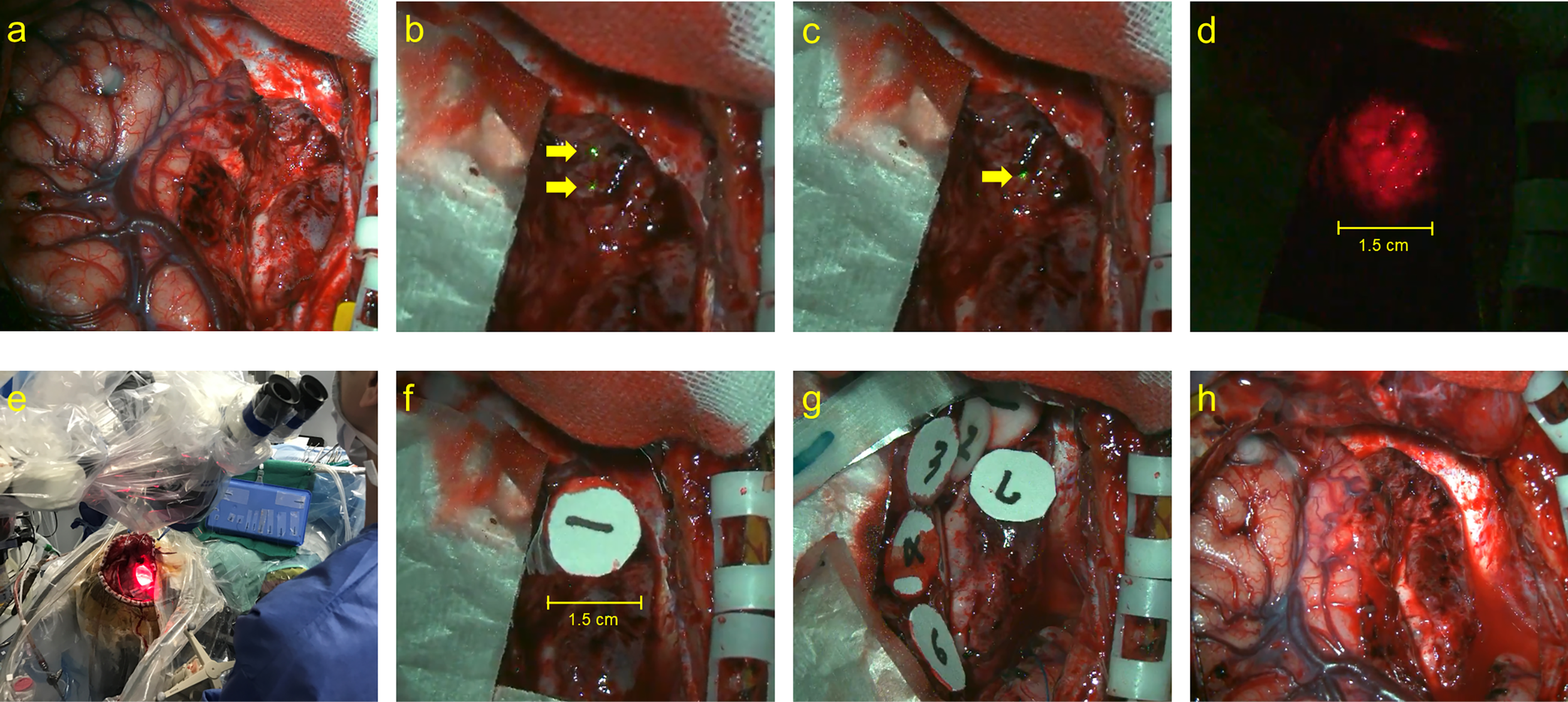 The actual performance of PD laser delivery during PDT. (A) The surgical view of tumor resected cavity, (B) the two identical green laser beams projected by a laser irradiation unit from a different site (yellow arrows), (C) the depth at which the two laser beams intersected in the resection cavity (yellow arrow), (D) the irradiation fields of approximately 1.5Â cm in diameter, (E) the macroscopical surgical view of PDT procedure, (F, G) the sterile numbered sheets with the same diameter of 1.5Â cm were placed to enable recognition of the irradiated area, and (H) the final view of the surgical cavity after PDT.