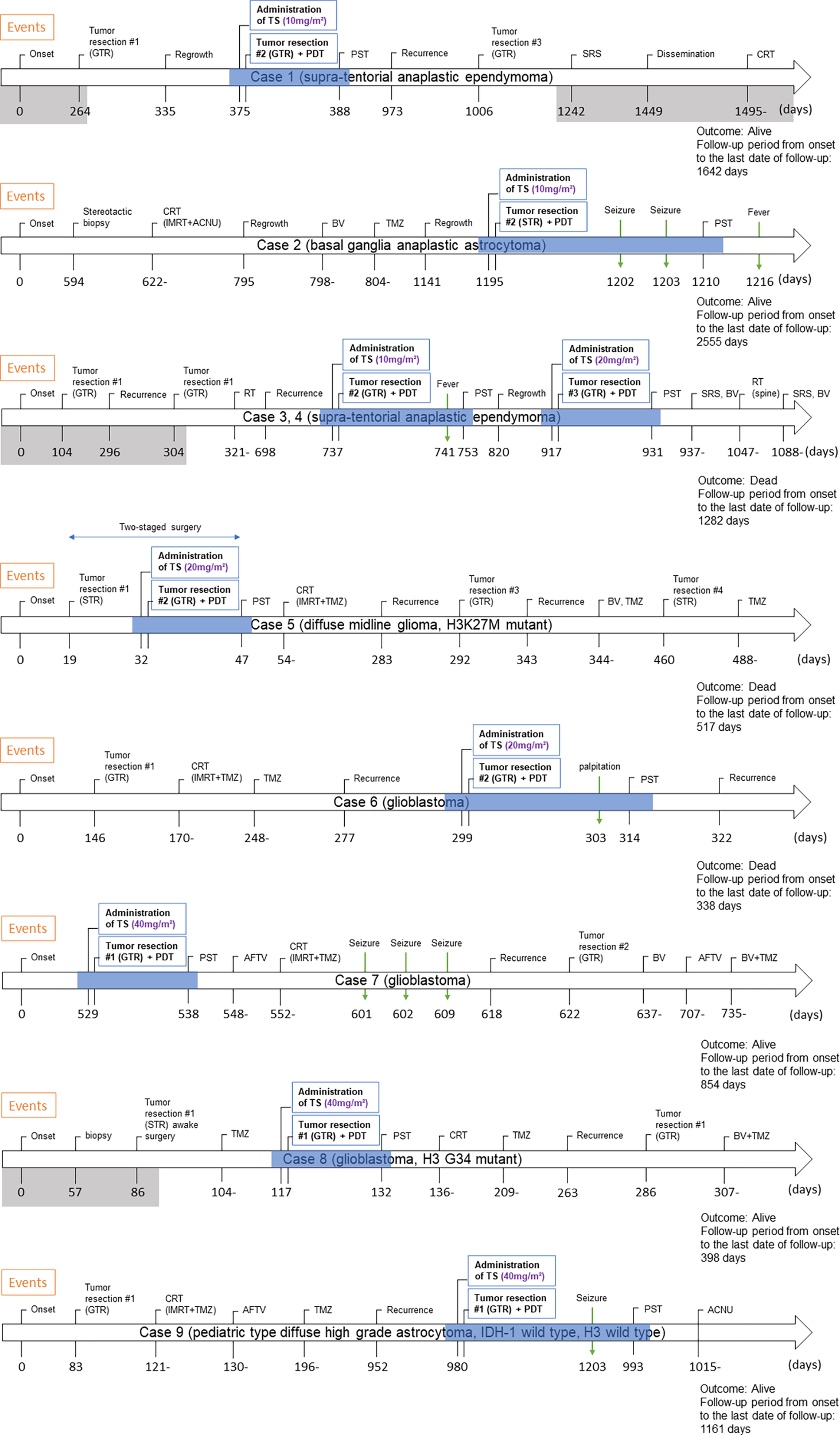 Clinical course of eight pediatric cases who underwent PDT. The period shaded in gray is the period of treatment at the previous hospital. The period during which PDT was performed is shown by blue shading. Abbreviations: GTR, gross total resection; TS, talaporfin sodium; PDT, photodynamic therapy; PST, photosensitivity test; SRS, stereotactic radiosurgery; CRT, chemo-radiotherapy; IMRT, intensity-modulated radiation therapy; ACNU, nimustine hydrochloride; BV, bevacizumab; TMZ, temozolomide; STR, subtotal resection; RT, radiation therapy; AFTV, autologous formalin-fixed tumor vaccine.