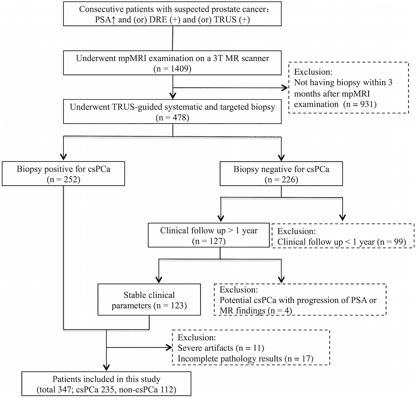 Our institute’s review board approved this retrospective study and waived the need for informed consent. The inclusion criteria for the study were mpMRI scans performed on a GE 750 3.0T MRI scanner at Peking University First Hospital from March 2017 to February 2020 on consecutive patients who underwent mpMRI before a biopsy, with a clinical suspicion of PCa due to an elevated serum prostate-specific antigen (PSA) level, abnormal digital rectal examination (DRE), and/or abnormal transrectal ultrasound (TRUS) results. Exclusion criteria were patients without a subsequent biopsy performed within 3 months after mpMRI examination, a negative biopsy for csPCa without clinical follow-up >1 year, or showing potential csPCa during the clinical follow-up (progression of PSA or MR findings), as well as images with severe artifacts or incomplete pathology results which could not be matched with MR images. In total, 347 patients were included. Figure 1 displays the flow diagram for the inclusion of patients in the study. In this study, csPCa was defined as the International Society of Urological Pathology Gleason grade group ≥2, i.e., Gleason Score ≥7. The characteristics of the 235 patients with csPCa included are shown in Table 1. The other 112 patients without csPCa (labeled non-csPCa with a mean age of 64.1 ± 7.5 years) had a median PSA level of 8.0 ng/ml, with an interquartile range of 6.6–13.1 ng/ml. The patients were randomly selected to populate the datasets for training (145 csPCa, 35 non-csPCa), validation (21 csPCa, 6 non-csPCa), and testing (69 csPCa, 71 non-csPCa).