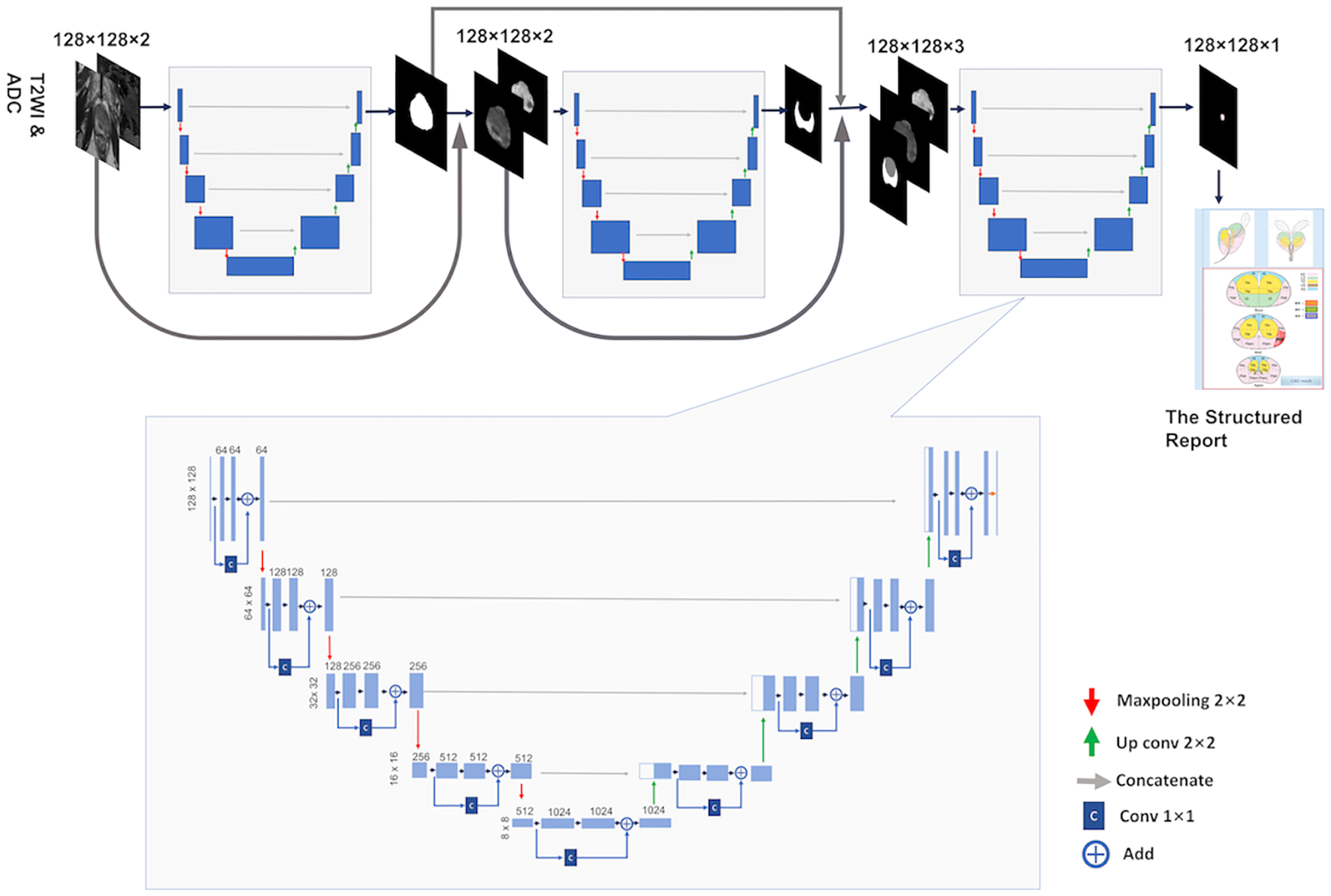 Our study aimed to develop a fully automated cascaded deep learning model for the detection and localization of csPCa using apparent diffusion coefficient (ADC) maps and T2-weighted imaging (T2WI), as well as to seamlessly integrate these AI predictions into the radiological workflow using the structured report.