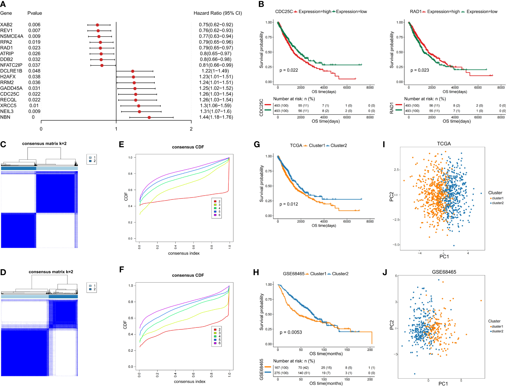Identification of two NSCLC subclasses based on the prognostic DDR-related genes. (A) Forest map of prognostic DDR-related genes. (B) Kaplan–Meier (KM) survival curves with transcriptomic profile of prognostic DDR-related gene. (C, D) Identification of NSCLC subclasses with PAC clustering using 17 prognostic DDR-related genes in the training and testing sets. (E, F) The CDF plot shows a flat middle segment for K = 2 in the training and testing sets. (G, H) OS of both subclasses (C1 and C2) in the training and testing sets. (I, J) PCA showing the distribution of the two NSCLC subclasses in the training and testing sets.