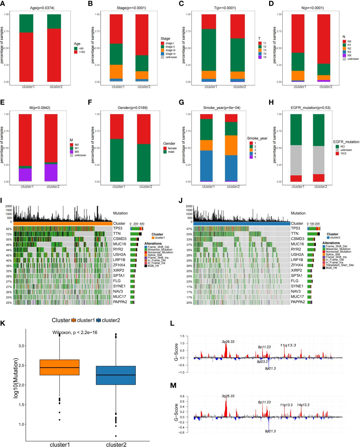 For better discrimination between the two NSCLC subclasses, Fisher’s exact test was used to evaluate the relationship between the clinical features of the two subtypes. Among two subtypes, there were significant differences in age, smoking, gender, T staging, and N staging, but not in M staging and EGFR mutation (Figures 3A–H).