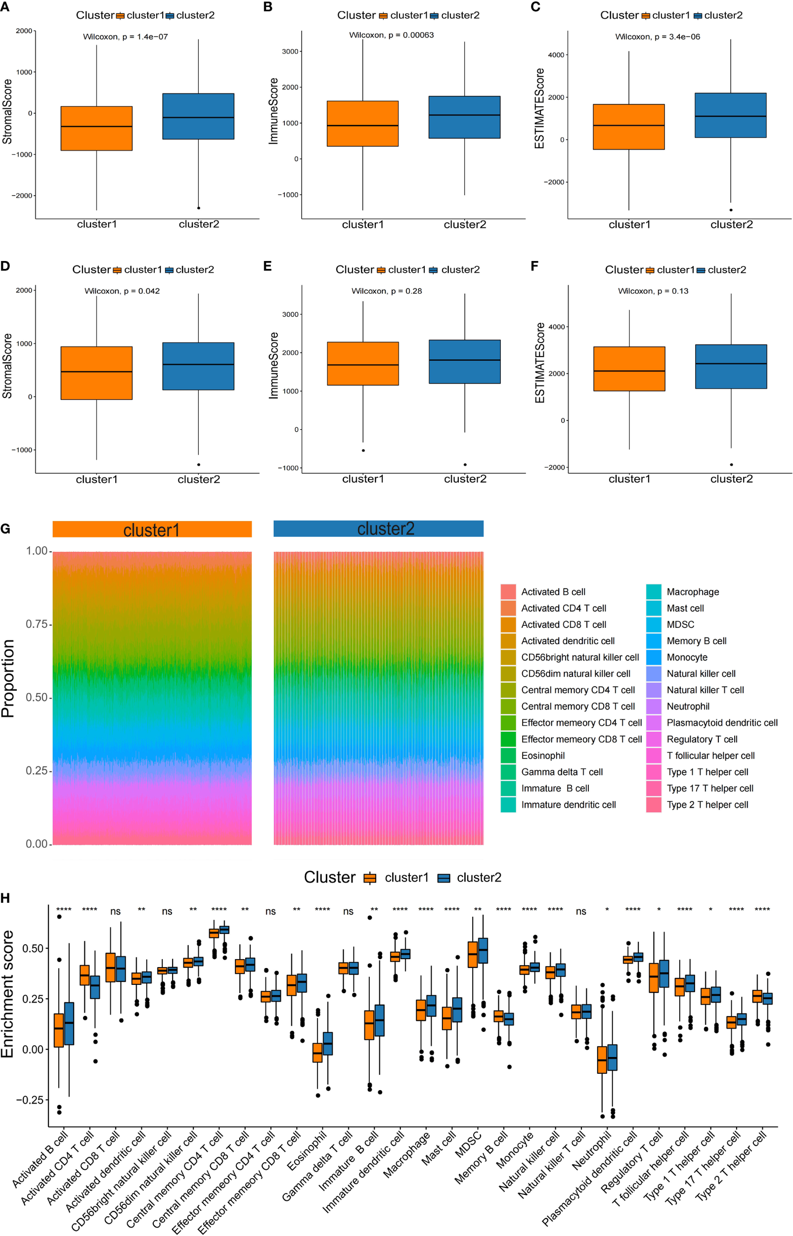 Characterization of the immune infiltration landscape of the two NSCLC subtypes. (A–F) Box plots of immune score, stromal score, and total score for NSCLC subclasses derived from ESTIMATE. The lines within boxes on box plots represent median values. The bottom and top lines represent the minimum and maximum values, respectively. (G) Heatmap showing the proportion of 28 types of infiltrating immune cells in C1 and C2 by ssGSEA algorithms. (H) Comparison of the proportion of 28 types of infiltrating immune cells between the subtypes by the rank sum test. NS denotes P>0.05, * indicates P ≤ 0.05, ** represents P ≤ 0.01, *** indicates P≤ 0.001, and **** indicates P≤0.0001.