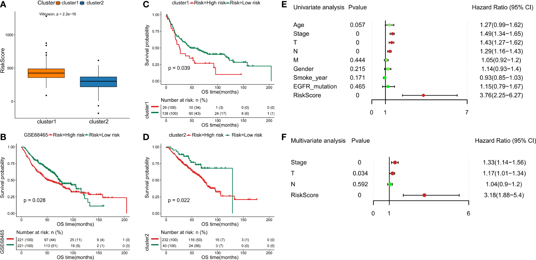 Validation of six DDR-related signatures by the LASSO regression model. (A) Distribution of risk scores in NSCLC subclasses. (B - D) Kaplan-Meier OS analysis of the prognostic DDR-related signature in NSCLC and NSCLC subtypes. (E) Evaluation of the prognostic values for different clinicopathological characteristics (age, smoking_year, gender, stage, T staging, N staging, M staging, and EGFR_mutation) as well as a risk score using univariate Cox regression analysis. (F) Multivariate Cox regression analysis was used to test the independence of the risk score and other factors for predicting the prognosis of NSCLC.