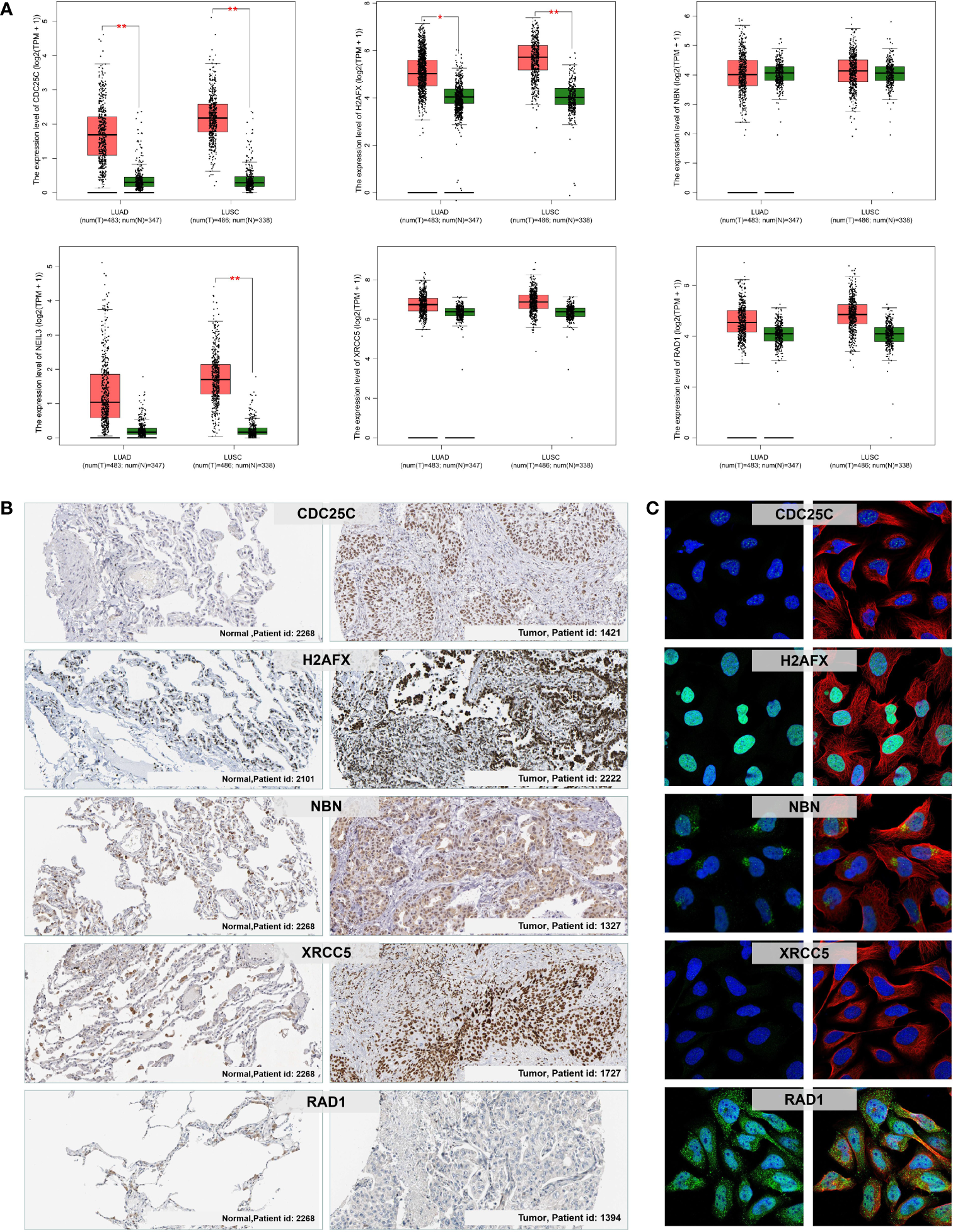 We further verified the expression level of the six prognostic DDR-related genes in NSCLC tumor and control normal lung tissues. Firstly, we evaluated the mRNA expression of six DDR-related genes in NSCLC tissues in GEPIA, which demonstrated that CDC25C, NEIL3, H2AFX, NBN, XRCC5 and RAD1 were all significantly higher expressed in NSCLC cancer tissues compared to with normal lung tissues (Figure 9A). Further, we analyzed the protein expression and distribution in clinical tissue specimens from the HPA online databases (www.proteinatlas.org). Immunohistochemistry and immunofluorescence analysis showed that CDC25C, H2AFX, NBN, XRCC5 and RAD1 had positive strong expression in NSCLC tumor tissues and negative weak staining in normal lung tissues (Figure 9B) and mainly distributed in nucleus and cytoplasm (Figure 9C).