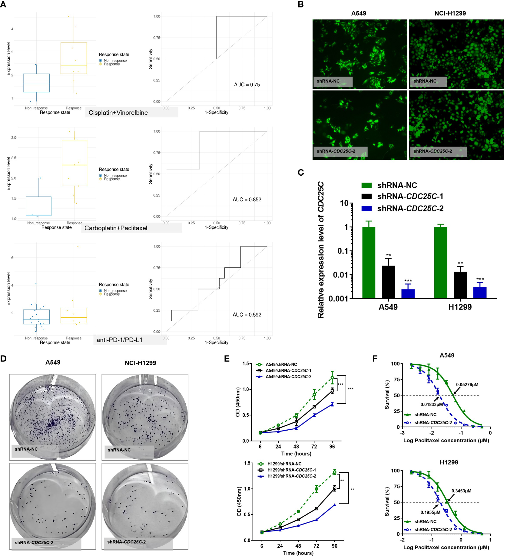 Among the above 6 DDR prognostic genes, CDC25C was found to have a good predictive effect on the treatment response of lung cancer (Figure 10A). As an important cell cycle regulatory protein, CDC25C participates in regulating G2/M progression and in mediating DNA damage repair. To better understand the function of six DDR-related gene Model, we selected CDC25C to verify its biological function in vitro. CDC25C expression was significantly reduced by shRNA-CDC25C in A549 and NCl-H1299 cells (Figures 10B, C). After silencing CDC25C expression, cell proliferation ability was significantly inhibited (Figures 10D, E). CDC25C is a phosphatase family specific cyclin that acts at the G2/M phase of mitosis. We further selected Paclitaxel, a cycle-specific antitumor drug, to analyze the effect of CDC25C expression on chemotherapy reactivity. It showed that decreased CDC25C expression resulted in increased Paclitaxel sensitivity of NSCLC cells (Figure 10F). These experimental results further demonstrated that CDC25C is a risk gene for NSCLC, it may contribute to the occurrence and development of NSCLC by promoting cell proliferation and affecting drug sensitivity.