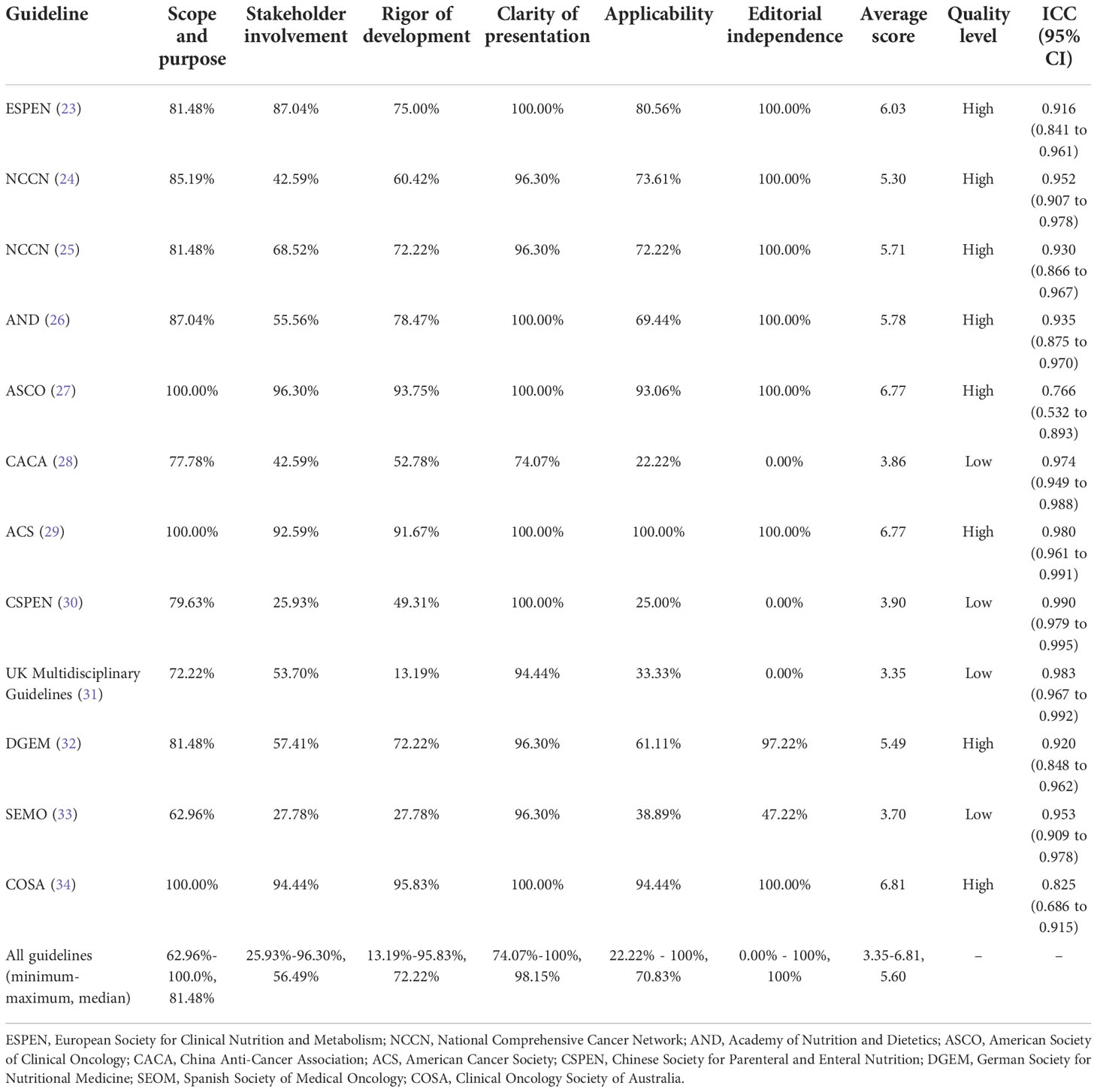 Healthcare professionals are responsible for providing patients with safe and high-quality treatment and care based on the best existing evidence (10). Guidelines promote high-quality cancer care. Clinical practice guidelines (CPGs) are formulated according to specific procedures, and high-quality CPGs serve as evidence-based resources to provide healthcare professionals with better decisions in clinical circumstances (11, 12). Many CPGs related to cancer nutrition management have been published, whereas those may vary dramatically in quality. Moreover, inconsistency across CPGs may dilute high-quality recommendations and increase confusion in clinical practice (13, 14). The Appraisal of Guidelines for Research and Evaluation II (AGREE II) was developed to evaluate the quality of reporting and the practice guideline development (15). The AGREE II Instrument has been widely used and validated since it was updated in 2010. Ng et al. (16) assessed the quality of HNC guidelines for complementary and alternative medicine recommendations and found that quality varied among the guidelines. Zhou et al. (17) evaluated the quality of CPGs of the nutritional risk for cancer patients, the majority of CPGs were rated as ‘strongly recommended’ or ‘recommended with modifications’.