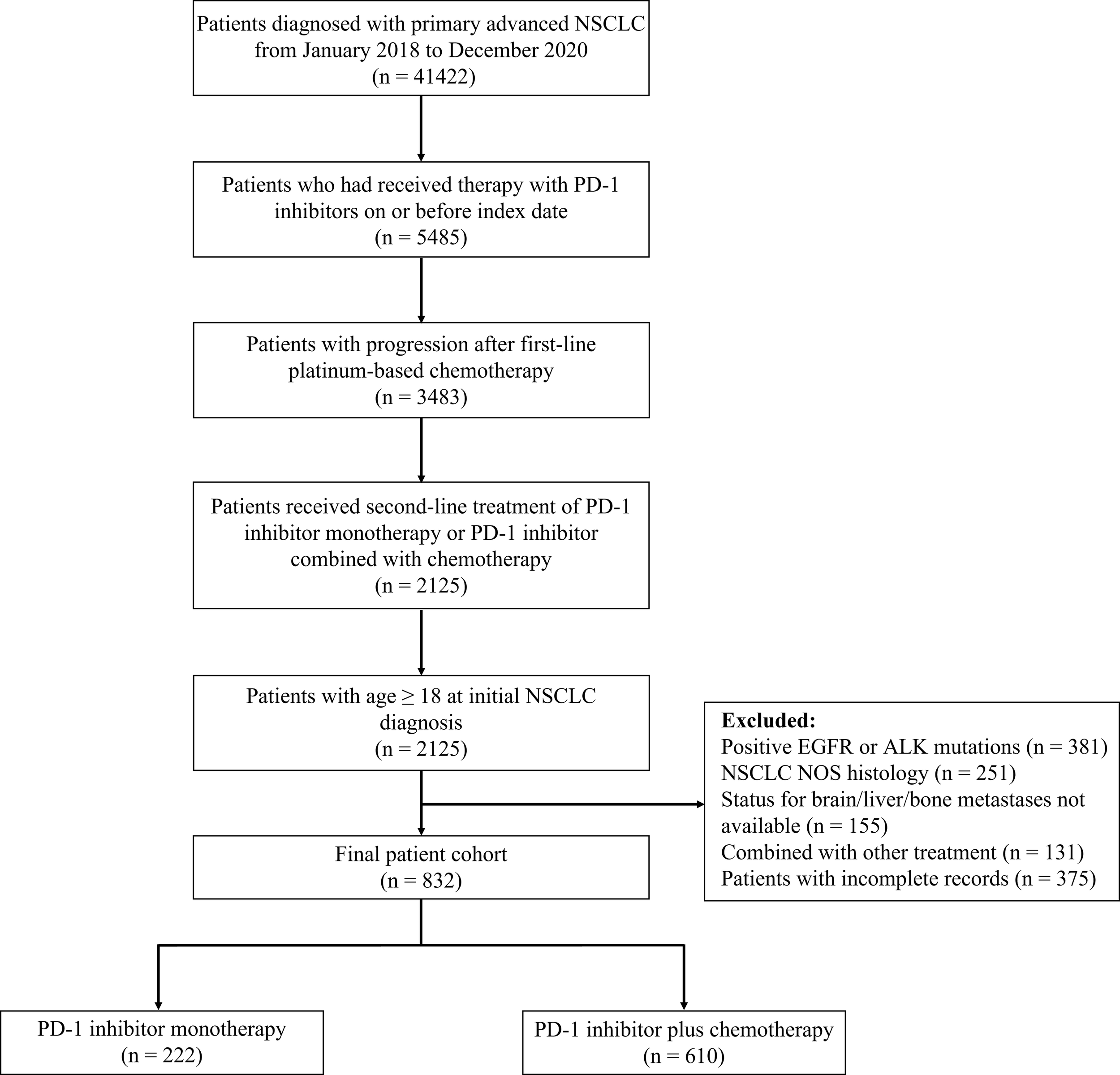 Study flow diagram. NSCLC, non-small-cell lung cancer; PD-1, programmed death 1; EGFR, epidermal growth factor receptor; ALK, anaplastic lymphoma kinase; NOS, not otherwise specified.