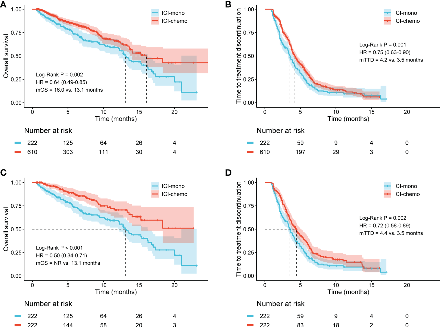 Kaplan-Meier curves for overall survival (OS) and time to treatment discontinuation (TTD) in the initial cohort and the matched cohort. (A) ICI-chemo versus ICI-mono for OS in the initial cohort; (B) ICI-chemo versus ICI-mono for TTD in the initial cohort; (C) ICI-chemo versus ICI-mono for OS in the matched cohort; (D) ICI-chemo versus ICI-mono for TTD in the matched cohort. HR, hazard ratio; NR, not reached.