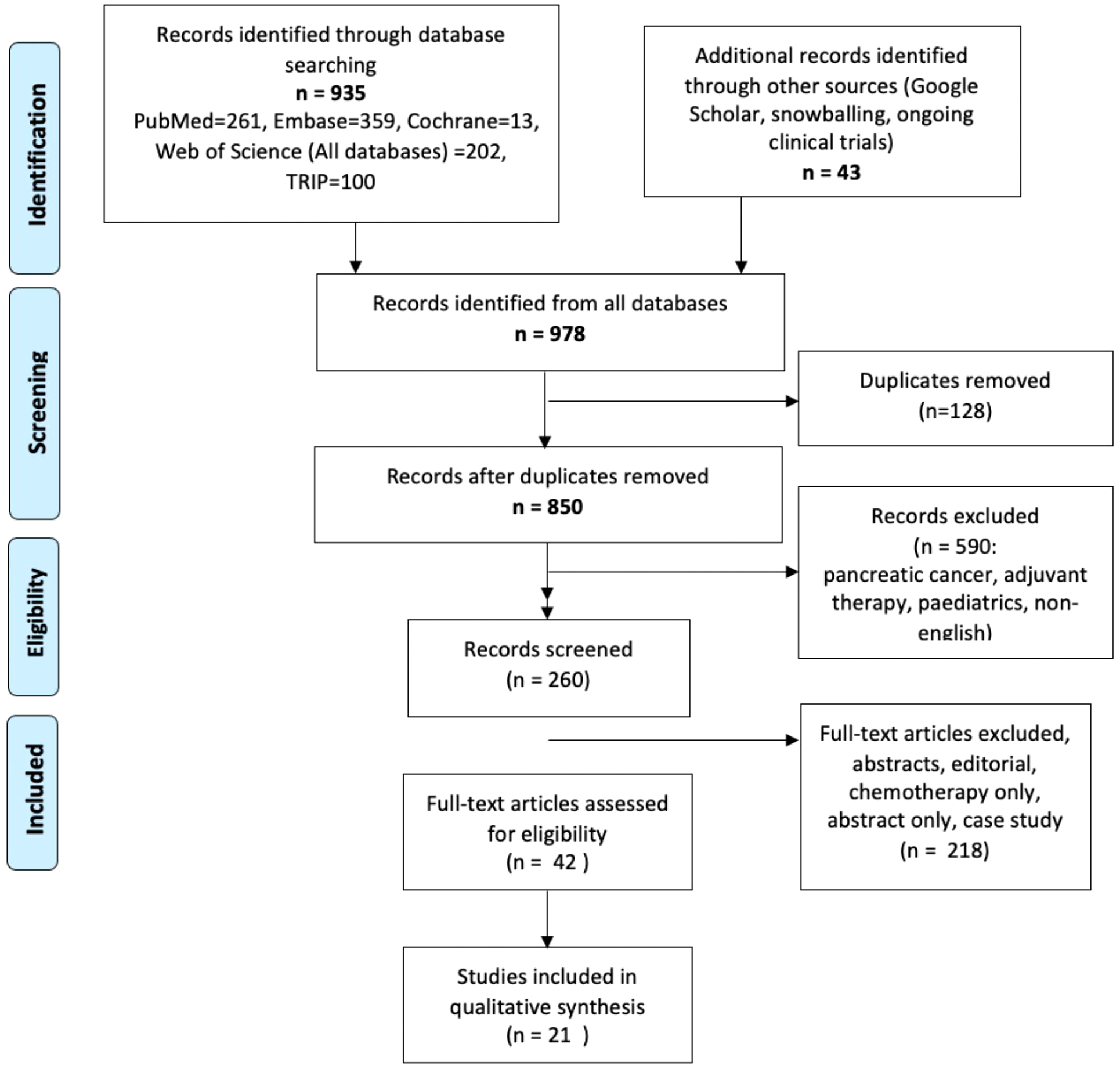 Search terms such as ‘neoadjuvant therapy’ and ‘cholangiocarcinoma’ were searched on multiple databases, including Pubmed, Ovid and Embase. They were then reviewed separately by two reviewers for inclusion criteria. 978 studies were initially identified from the search strategy, with 21 being included in this review.