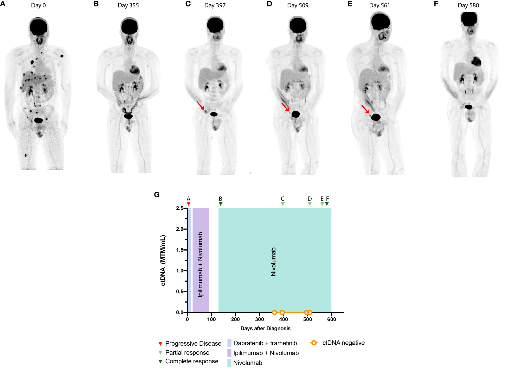 Tumor-specific mutational analysis revealed the presence of the BRAFV600E mutation (Supplementary Table 1). As such, the patient was initiated on dabrafenib (150 mg, PO, twice daily) and trametinib (2 mg, PO daily). At this time, he presented to our tertiary academic center for a second opinion. After a discussion of risk and benefits, the patient switched to ipilimumab (3 mg/kg) and nivolumab (1 mg/kg). After three cycles, the patient developed immune-related adverse effects (IRAEs) with grade 1 rash, grade 1 hepatitis, and grade 3 colitis, which was treated with prednisone (1 mg/kg) followed by a slow taper. Imaging at this time showed complete response to the ICI regimen (Figure 1B). Ipilimumab was permanently discontinued, and maintenance nivolumab (480 mg, IV every 4 weeks) was continued after resolution of IRAE symptoms. During ICI treatment, an interval PET-CT showed disease response, and ctDNA analysis was negative, showing 0 MTM/ml. However, 10 months after ICI initiation, a restaging PET-CT scan showed increased metabolic activity in the right external iliac lymph node, concerning for disease recurrence (Figure 1C). Repeat imaging 2 months later showed interval stability of the size and metabolic activity of an inguinal lymph node (Figure 1D). ctDNA analysis at this time was once again negative. A repeat scan 6 months after the initial concern for progression showed resolution of the metabolic activity of the right iliac lymph node (Figure 1E). Subsequent scans have demonstrated a complete metabolic response (Figure 1F). Treatment with monotherapy nivolumab was continued throughout the follow-up period.