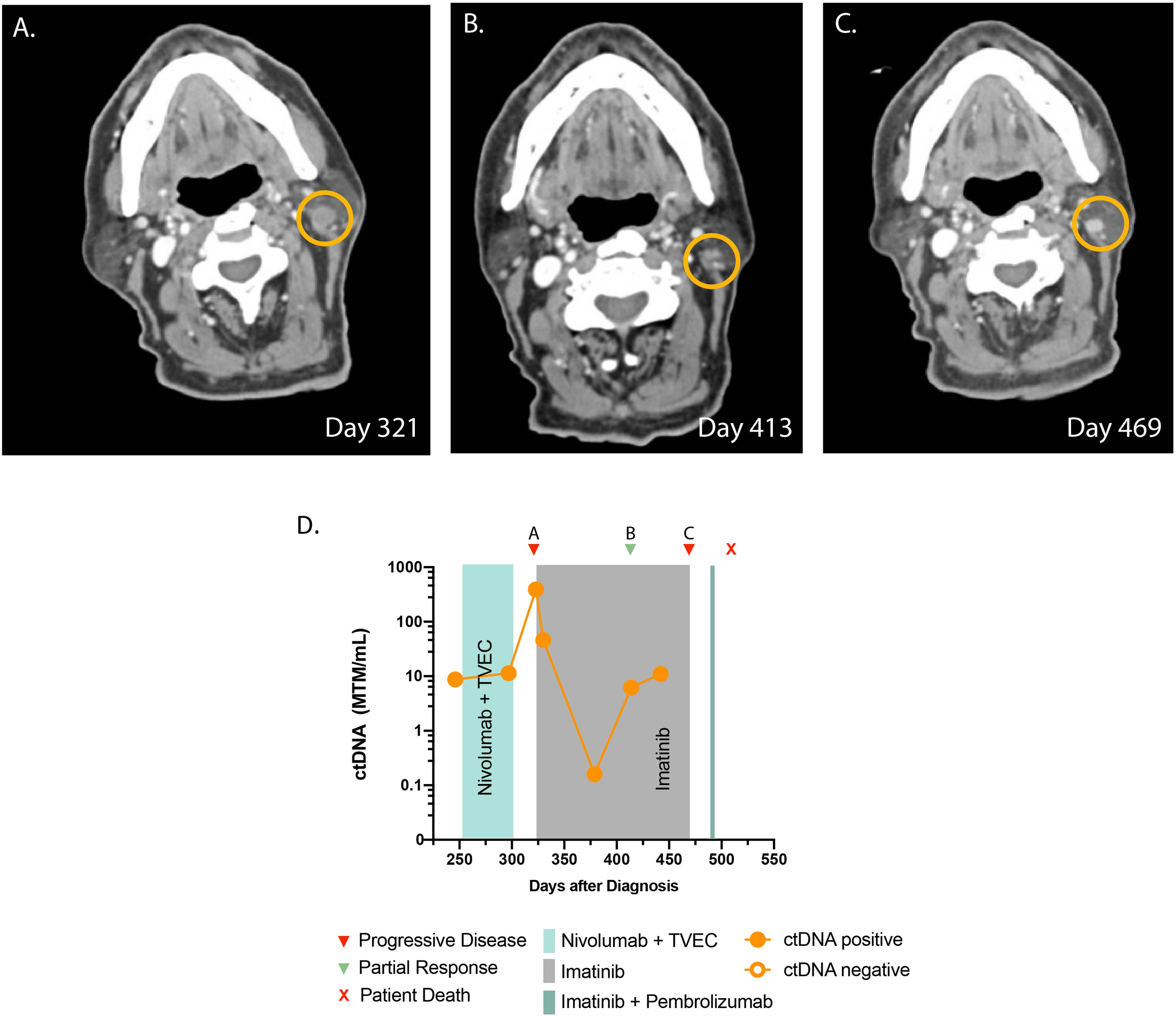 Timeline and imaging of case 2. (A) Cross-sectional CT demonstrates progression of infiltrative lesions in a left level 2B lymph node prior to starting imatinib. (B) CT demonstrates a decrease in the size of the lesion after starting imatinib. (C) CT demonstrates progressive disease. (D) Timeline of administered systemic therapy and ctDNA changes (no ctDNA is available beyond day 450 as the patient opted not to have the test).