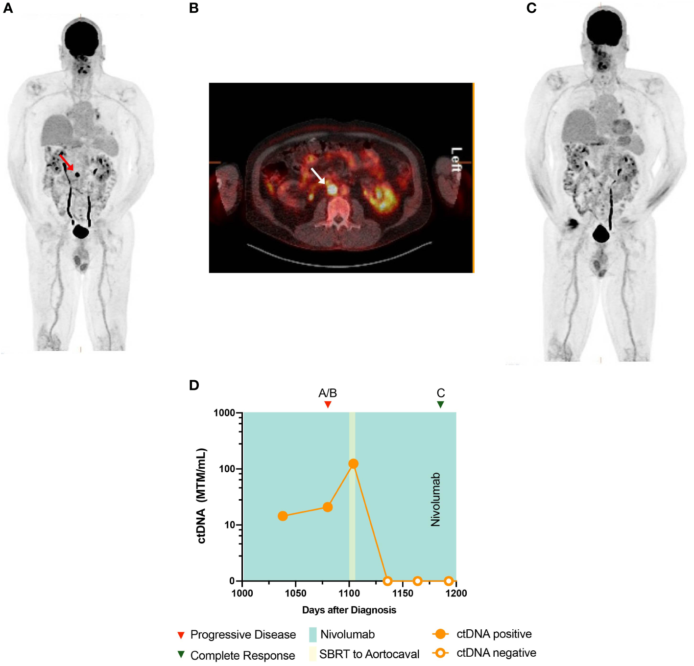 Timeline and imaging of case 3. (A, B) PET demonstrates an aortocaval lymph node with a maximum SUV of 21.8. (C) PET demonstrates resolution of the aortocaval lymph node after radiation therapy. (D) Timeline of case 3 and ctDNA changes.