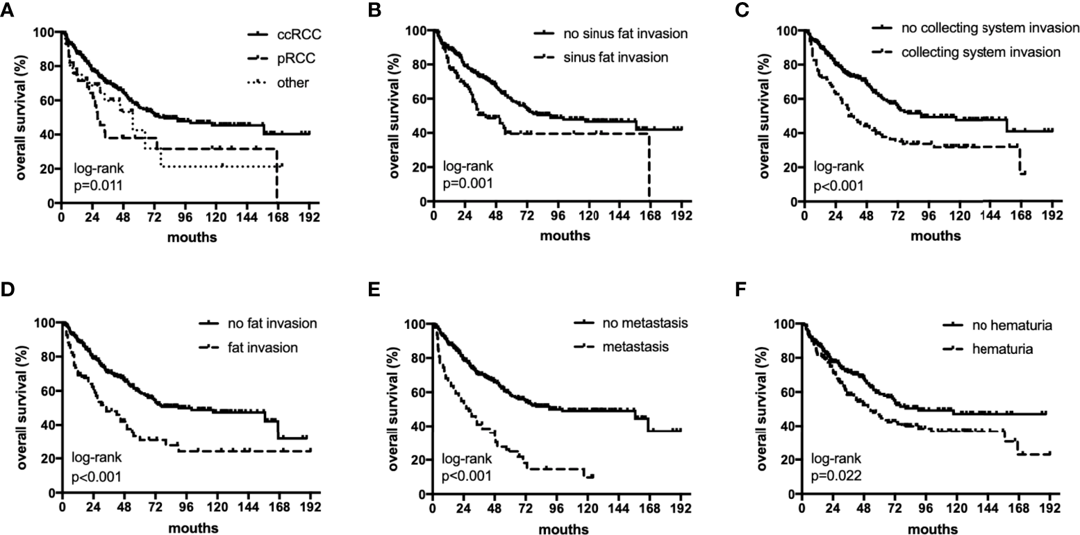 TT levels 0–IV were observed in 132 (37.71%), 43 (12.29%), 134 (38.29%), 20 (5.71) and 21 (6.00%) patients, respectively. Papillary (pRCC), clear cell, and other histological subtypes of RCC were detected in 28 (8.00%), 286 (81.71%), and 36 (10.29%) patients, respectively. Compared to the clear cell cohort, collecting systemic invasion (46.43 vs. 25.17%; p = 0.030) and lymph node metastasis (39.29 vs. 11.54%; p < 0.01) were more common in the pRCC cohort. Kaplan–Meier analyses showed that patients with pRCC and other subtypes had significantly worse OS and PFS compared to patients with the clear cell subtype (p < 0.05). Multivariate analyses revealed that histology was independently associated with reduced OS and PFS, including among patients without lymph node and distant metastasis (N0M0).