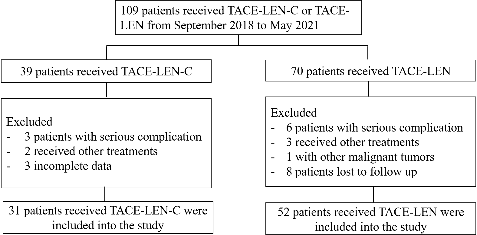 During the follow-up, there were a total of 109 patients (61 in Wuhan Union hospital, 48 in The Fifth Medical Center of Chinese, PLA General Hospital) with uHCC who received TACE-LEN-C (n=39) or TACE - LEN (n=70). However, 8 and 18 patients in the TACE-LEN-C and TACE-LEN groups, respectively were excluded according to the exclusion criteria. The flowchart is shown in Figure 1. Finally, 31 patients in the TACE-LEN-C group and 52 in the TACE-LEN group were enrolled in the study. There was no statistical difference in baseline variables between the two groups (Table 1).