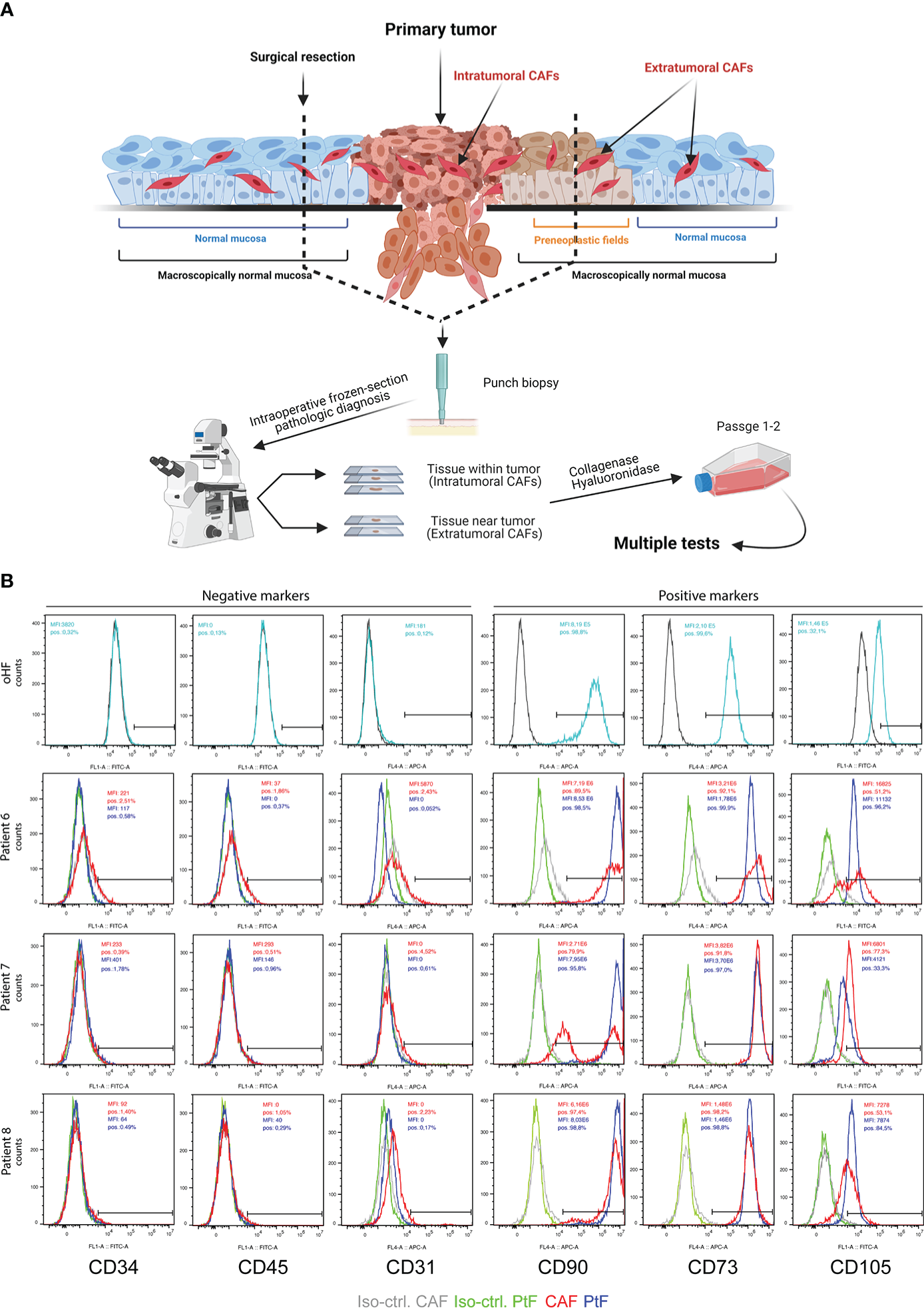 Figure 1 Establishment of PtFs and CAFs from OPSCC patient samples. (A) Schematic representation of the workflow to establish peri- and intratumoral CAFs (PtFs and CAFs, respectively). Punch biopsies were taken from areas of microscopically normal mucosa and primary OPSCC. After pathological diagnosis on frozen tissue sections during surgery, single cells were generated from punch biopsies and PtFs and CAFs were isolated. (B) PtFs and CAFs in passages 1-2 and hOFs were stained for the expression of fibroblast markers (CD90, CD73 and CD105) and markers for leukocytes, hematopoietic cells, and endothelial cells (CD45, CD34 and CD31, respectively). Expression levels were assessed by flow cytometry and percentage of positive cells standardized for cognate isotype controls are shown in the top right corner of the histogram for both PtFs (blue) and CAFs (red). The same markers were assessed in human oral fibroblasts (hOF) and are shown in the upper panels. Figure 1A was generated using BioRender und publication license number WQ242UAZXN