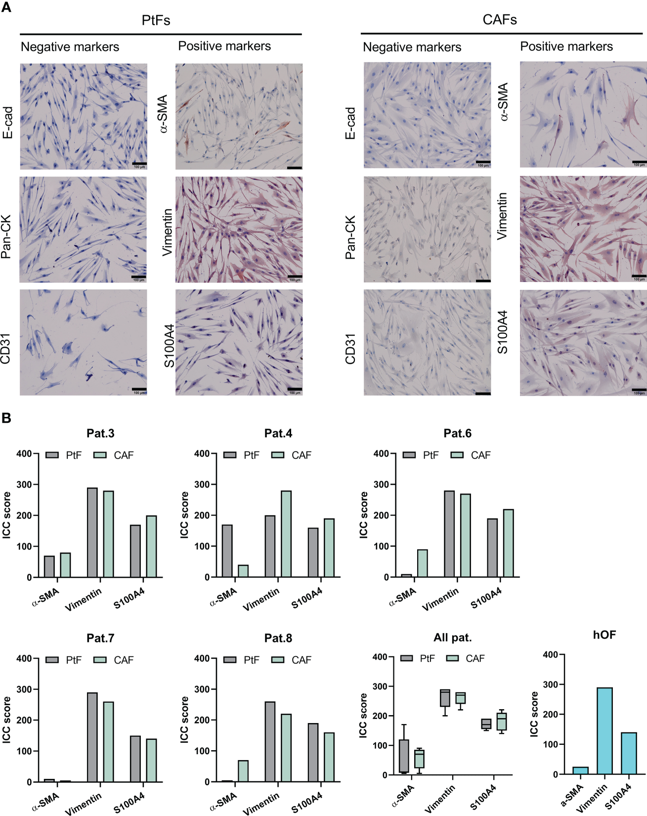 Figure 2 Immunocytochemistry (ICC)-based characterization of PtFs and CAFs. (A) Expression of epithelial markers [E-cadherin, pan-cytokeratin (Pan-CK)], endothelial marker (CD31), and the fibroblast markers (α-SMA, Vimentin, S100A4) in PtFs and CAFs was assessed through ICC staining and counter staining with hematoxylin-eosin during passages 1-2. Representative images are shown. (B) ICC scoring was performed on fibroblast markers of individual patients (Pat.3, Pat.4, Pat.6, Pat.7 and Pat.8), all patients combined, and human oral fibroblast (hOF; bottom right).