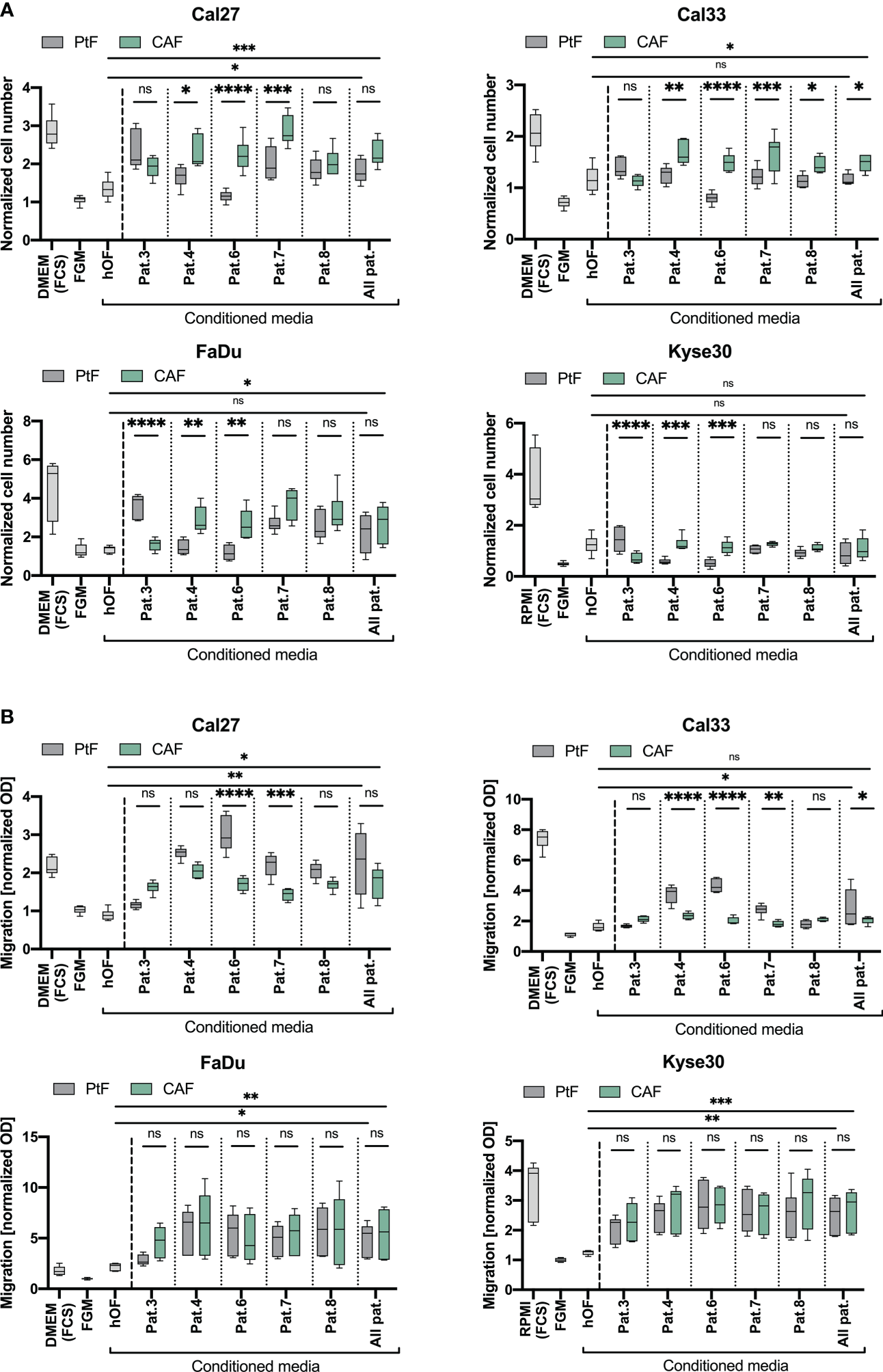 Figure 4 Effect of PtFs and CAFs on carcinoma cell line proliferation and migration. (A) Cal27, Cal33, FaDu and Kyse30 cell lines were cultured for 72 hours in human oral fibroblast (oHF)-, PtF-, or CAF-conditioned supernatant. Cell numbers are normalized to D0 and to DMEM/RPMI w/o FCS culture condition. Mean ± SD normalized cell numbers of controls (cell cultured in DMEM/RPMI with FCS, or in FGM) and treatment groups (cells cultured with hOF/PtF/CAF-conditioned FGM of individual patients) of n=3 independent experiments are shown. (B) Migration of Cal27, Cal33, FaDu and Kyse30 cells was measured using a Boyden chamber with FGM, DMEM/RPMI with FBS, and conditioned hOF/PtF/CAF-conditioned supernatant served as attractants in the lower chamber. Normalized OD values are plotted from n=3 individual experiments. P-values: ns > 0.05; * ≤0.05; ** ≤0.01; *** ≤0.001; **** ≤0.0001.